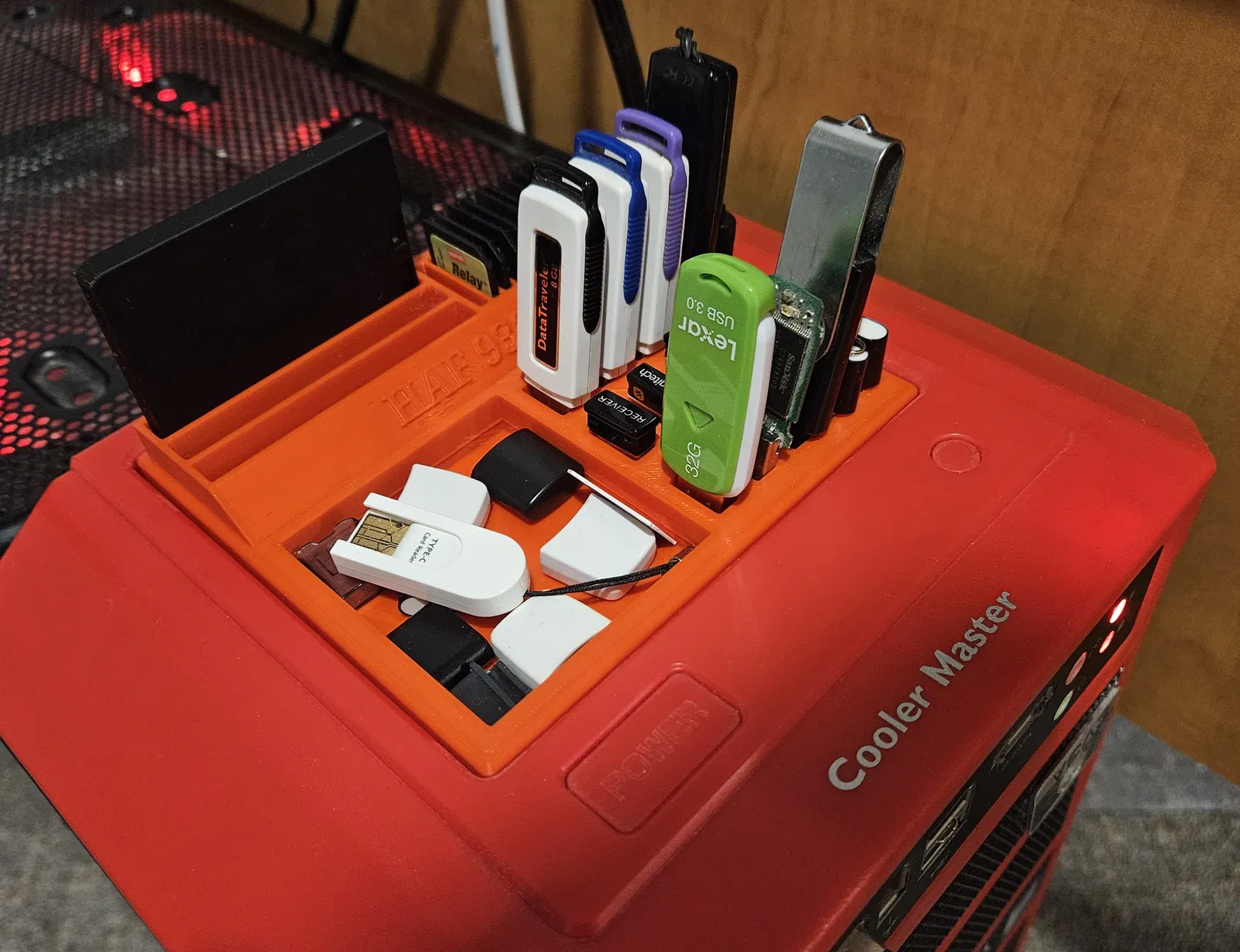 Tấm che trên tùy chỉnh cho thùng máy full tower Cooler Master HAF 932. Bao gồm 15 khe để chứa USB, 12 khe cho thẻ SD, 3 khe cho hộp đựng thẻ microSD hoặc SD này, và một khay nhỏ cho bất cứ thứ gì khác.