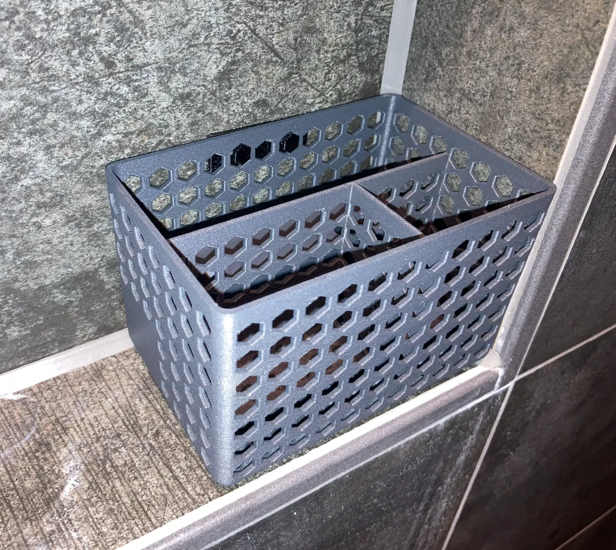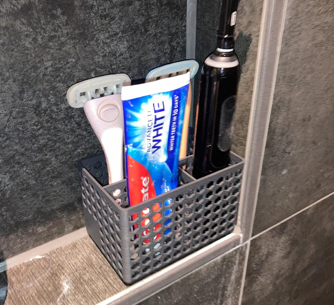 Hai khay dễ in để sắp xếp đồ đạc nhỏ trong phòng tắm. Khay lớn được thiết kế để vừa với hốc vòi sen, và có thể đựng hai dao cạo Estrid, bàn chải đánh răng điện và kem đánh răng. Kẹp giúp khay không bị rơi ra, và có thể cố định bằng băng dính hai mặt.