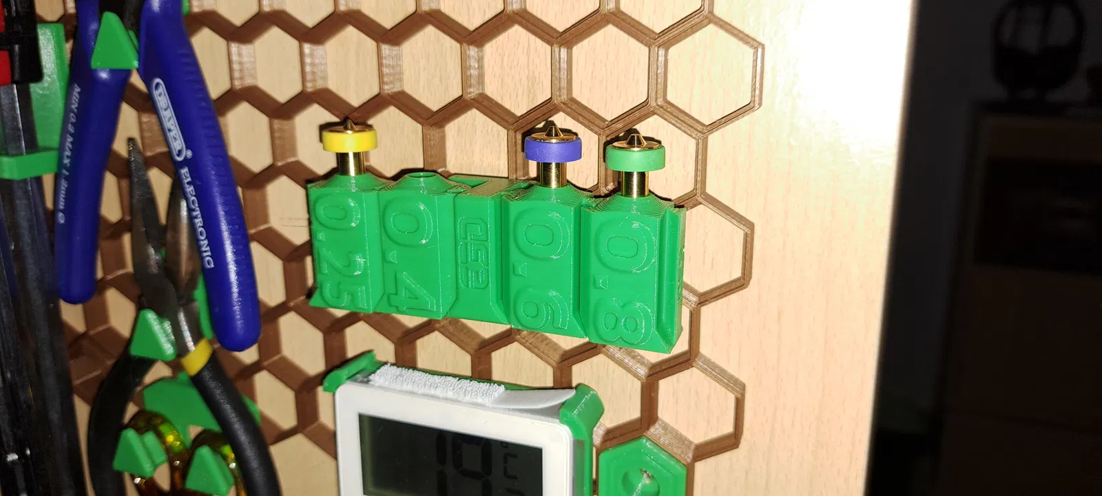 Giá đỡ đầu phun E3D Revo 6, thiết kế để gắn lên tường lưới tổ ong. Có hai phiên bản để phù hợp với cách bố trí tổ ong khác nhau, đảm bảo sự tiện lợi và tùy chỉnh cho không gian lưu trữ của bạn.