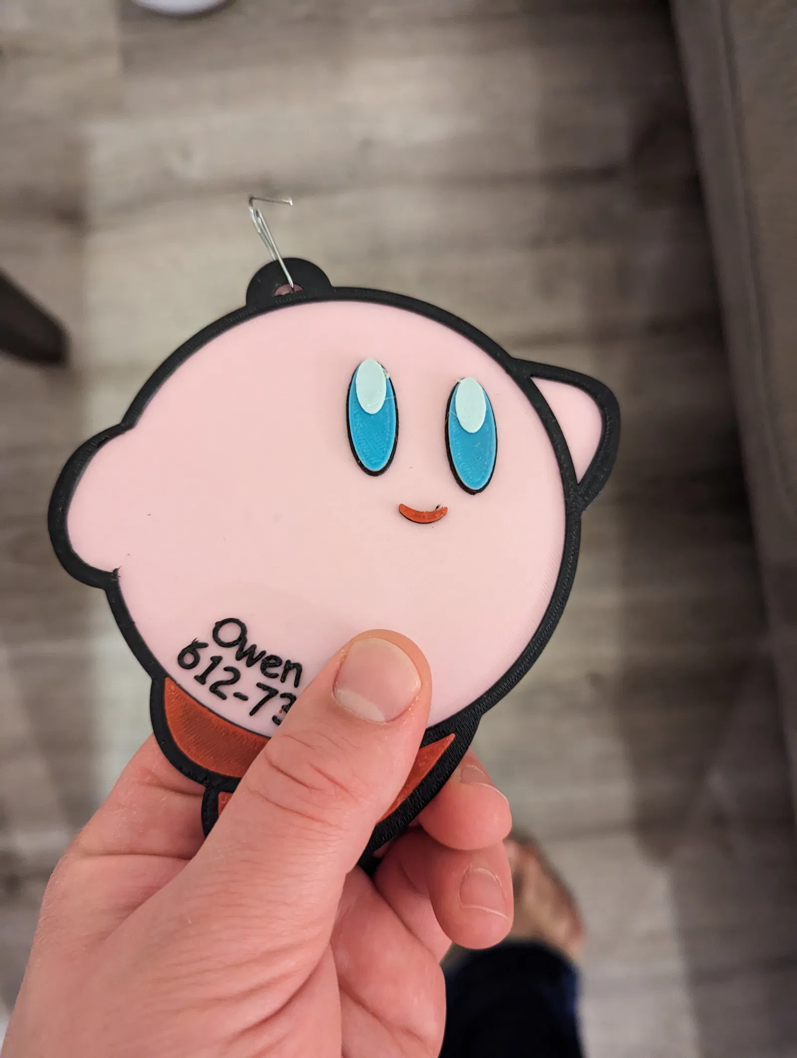 Thẻ đeo túi làm thủ công với nền Kirby. Bạn có thể tùy chỉnh tên trong file và in. Sử dụng nhiều lớp màu để tạo hiệu ứng đa sắc, không cần support.