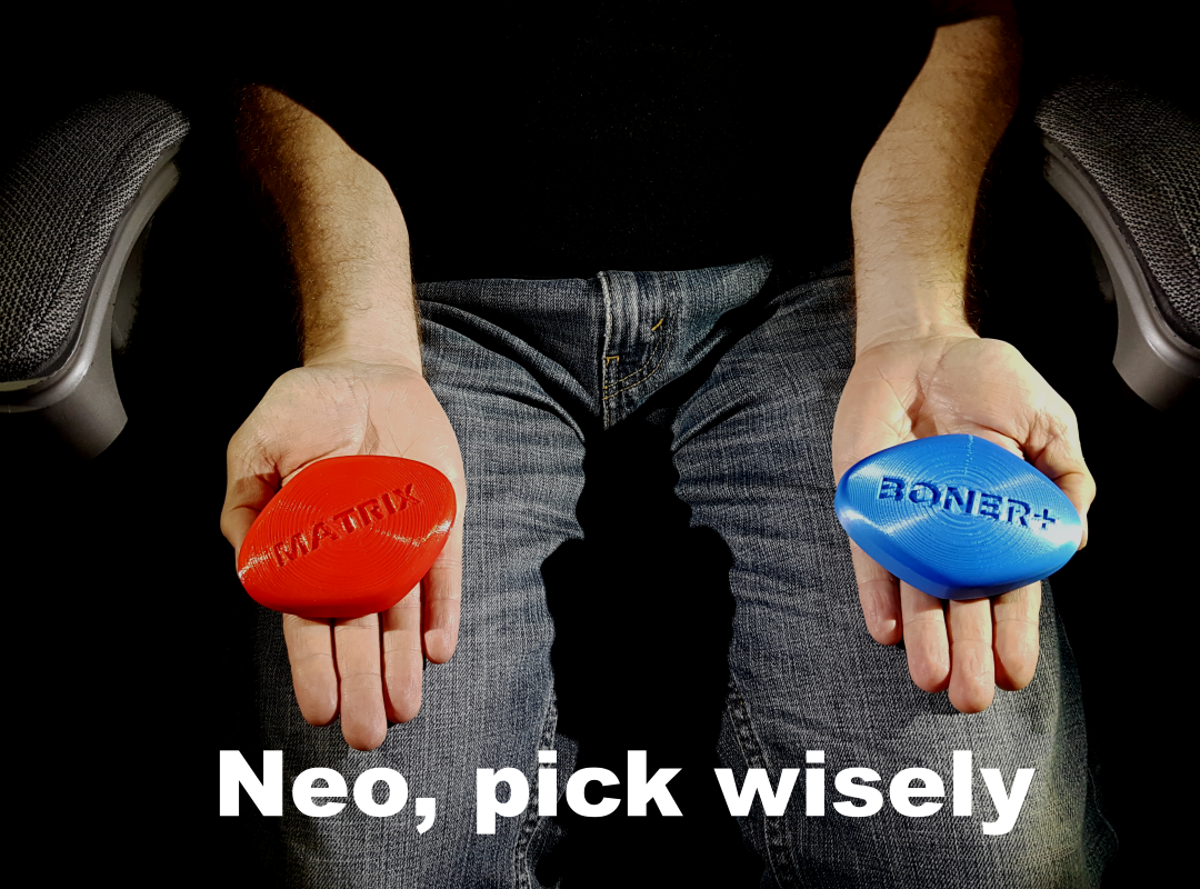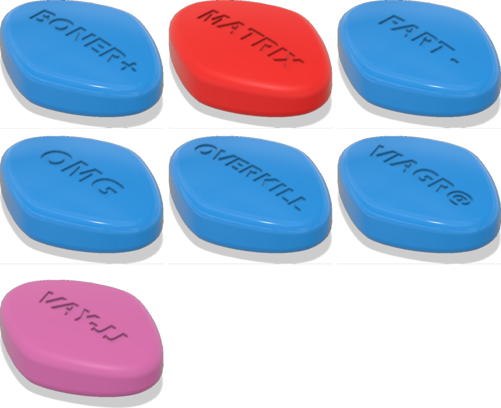 Mẫu "Viên thuốc xanh to bự" này là để làm trò cười, lấy cảm hứng từ phim Matrix. Mẫu có nhiều chủ đề vui nhộn, có cả mẫu trống để bạn tự thiết kế. Kích thước mẫu gốc là 120mm nhưng có thể scale lại. Lưu ý đây chỉ là đồ chơi, đừng nuốt nha!