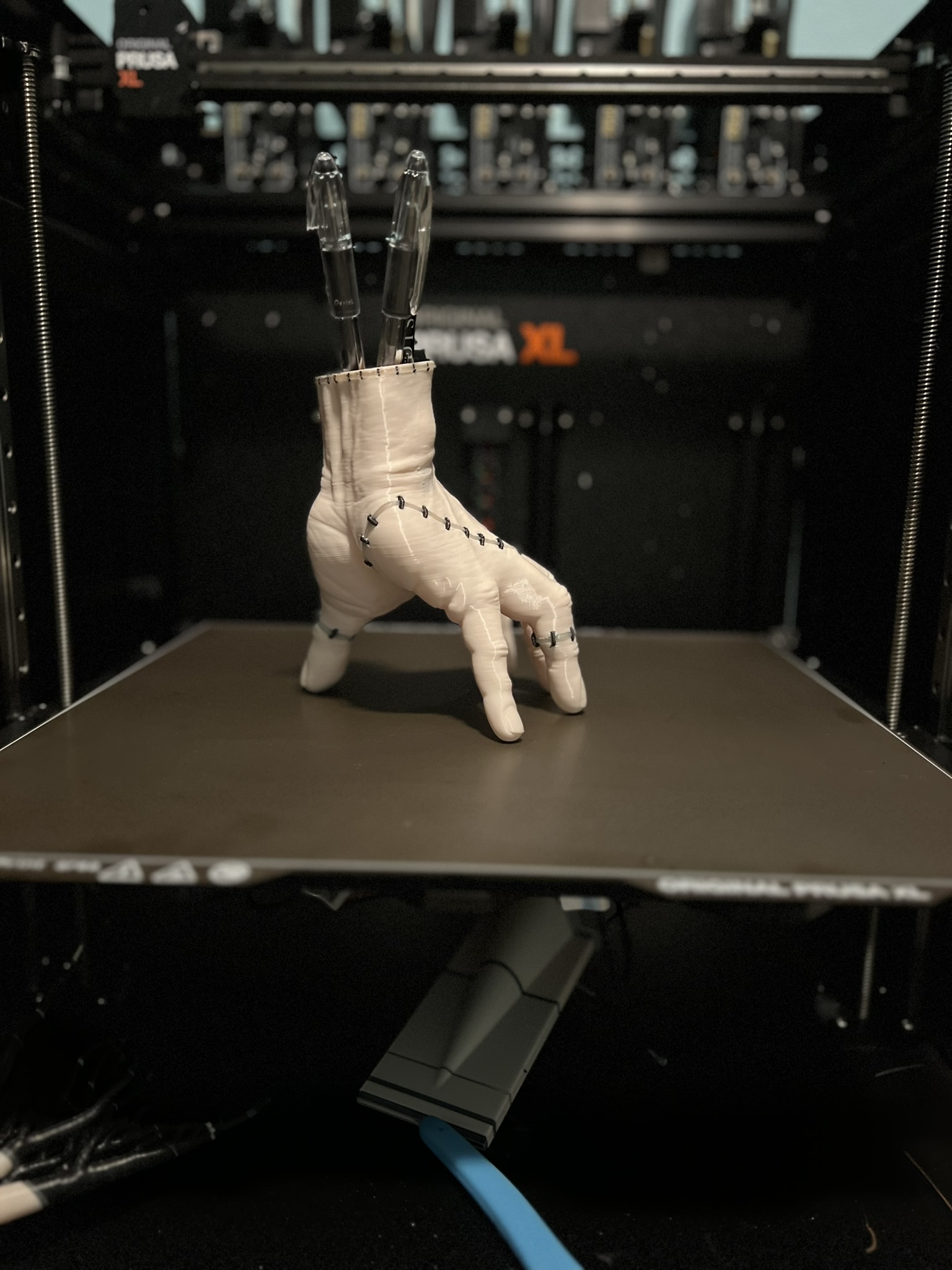 Mô hình Thing trong phim Wednesday với ba màu: da, sẹo và đường chỉ khâu. Người dùng đã gặp chút trục trặc với dây nhựa Hatchbox bị kẹt nhưng cuối cùng đã in thành công với bản in tuyệt đẹp.