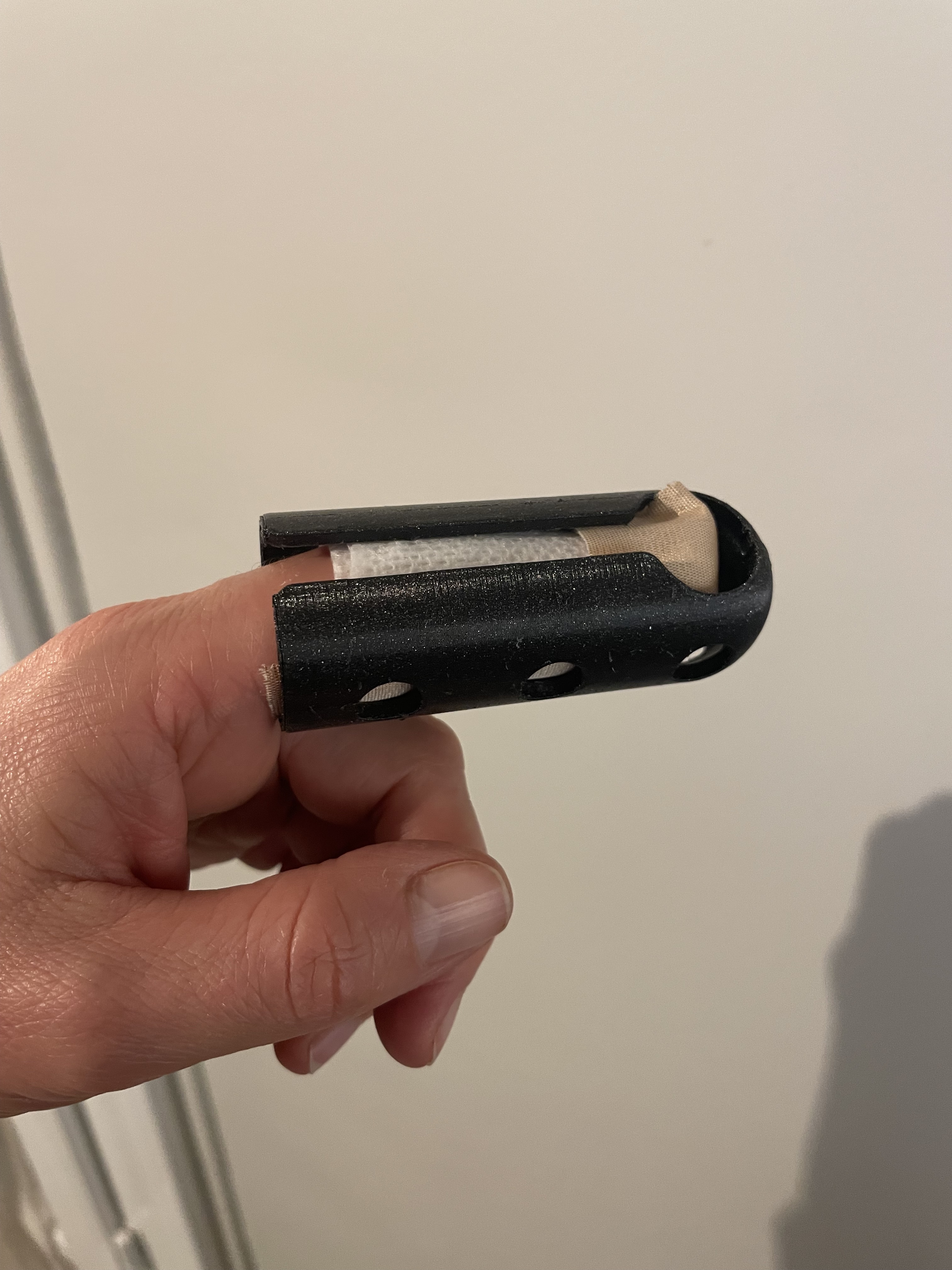 Mẫu nẹp bảo vệ ngón tay, lấy cảm hứng từ thiết kế của Mr. E Menace. Sản phẩm có thêm lỗ thông gió hai bên và tăng cường bảo vệ vùng móng. Kích thước dài 65 mm, đường kính 26 mm.