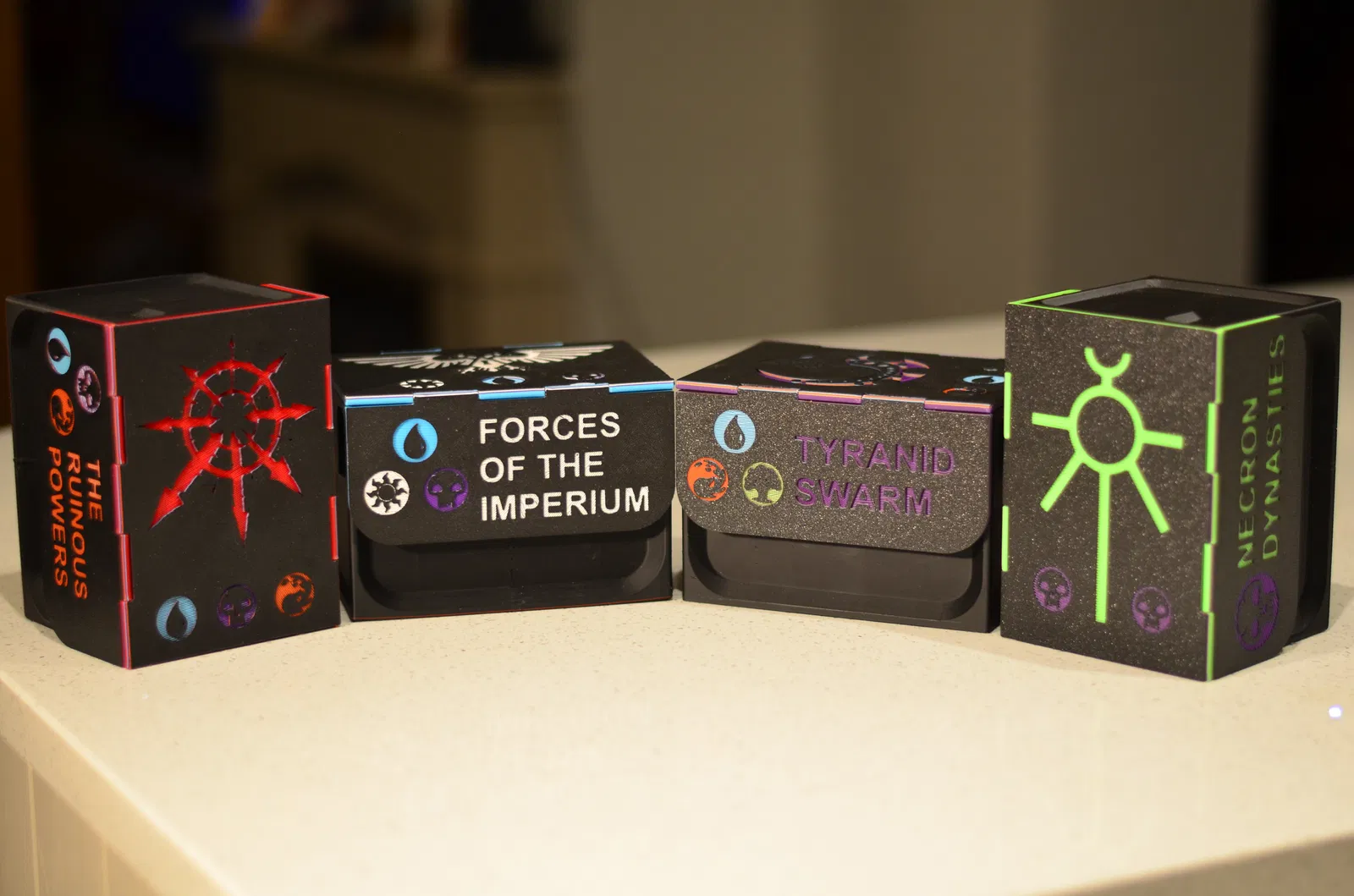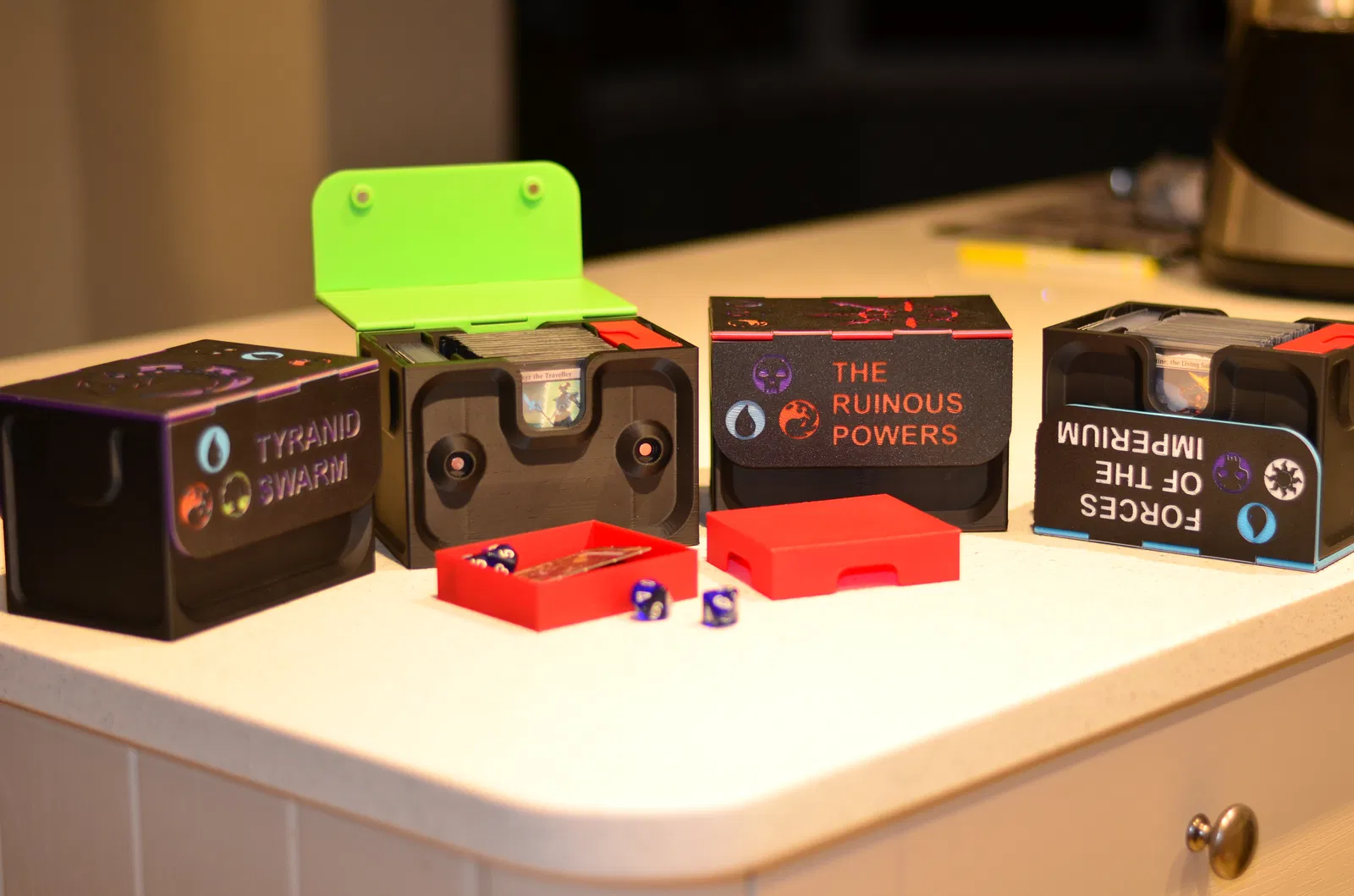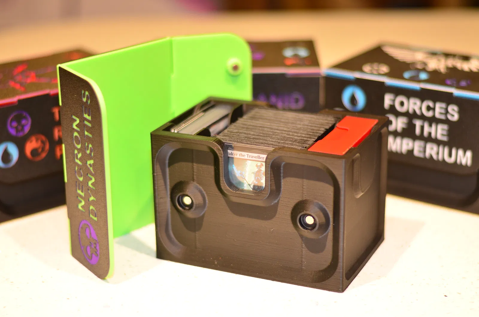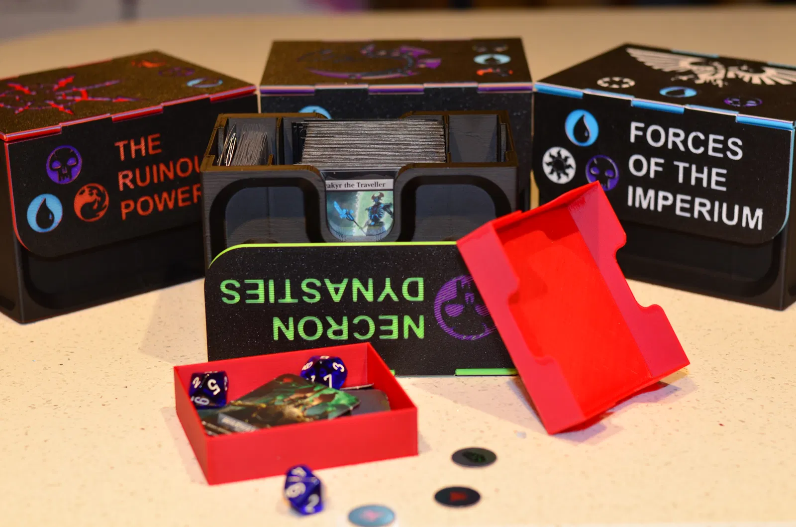 Hộp đựng bài "The Apprentice Commander" này phù hợp với các game TCG như Magic the Gathering và Pokémon, chứa hơn 100 thẻ bài bọc hai lớp. Có ngăn phụ cho thẻ sideboard và token, có thể in dễ dàng bằng PLA, ABS, PETG, không cần support. Yêu cầu 8 nam châm 6x3mm và keo siêu dính.