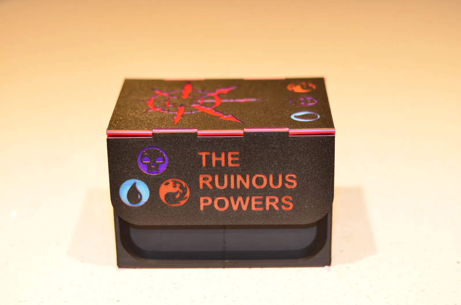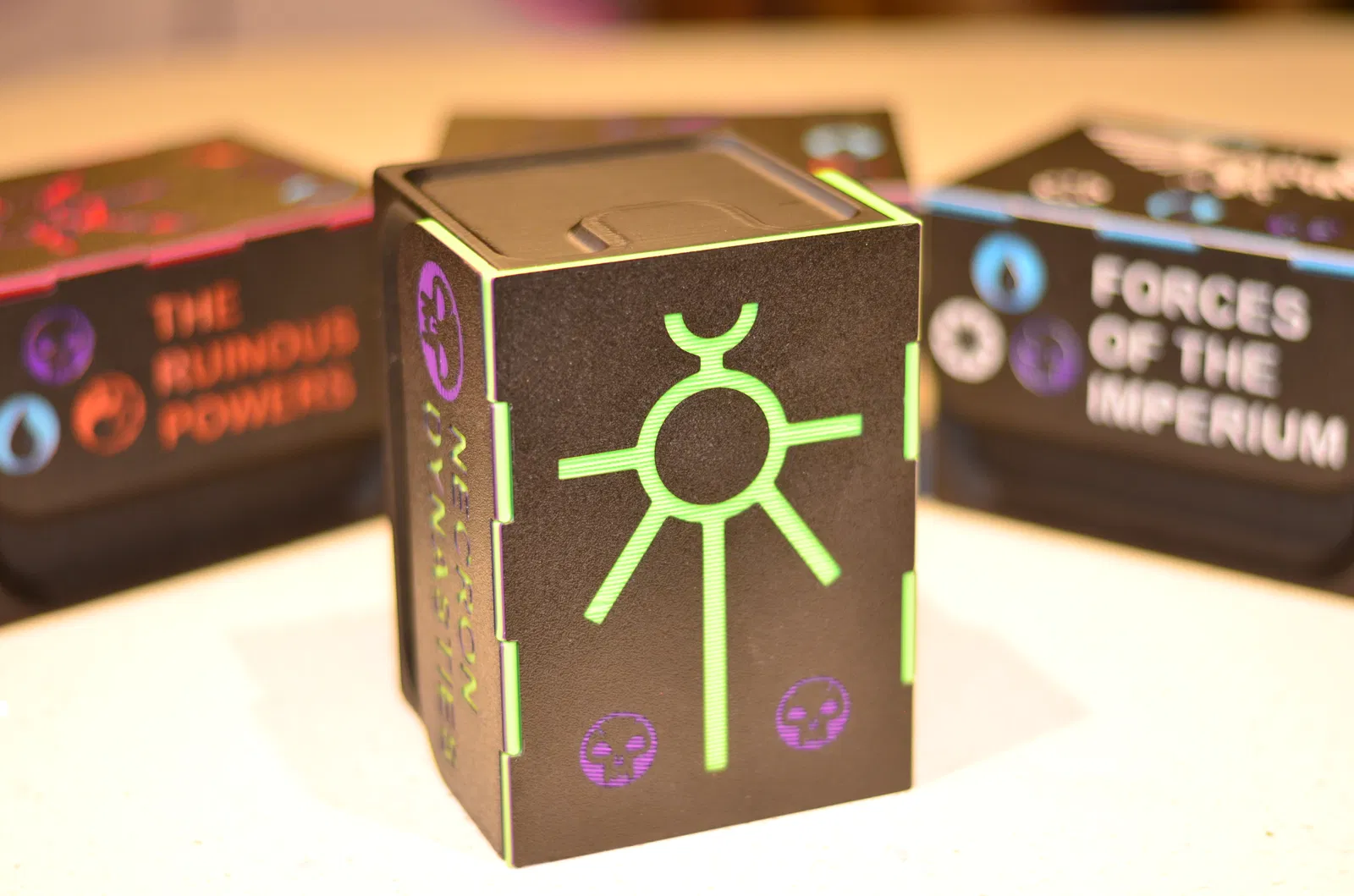Hộp đựng bài này có thể chứa thoải mái hơn 100 thẻ bài được bọc hai lớp và có hai ngăn bên hông có thể dùng để chứa các thẻ phụ (sideboard) và token.