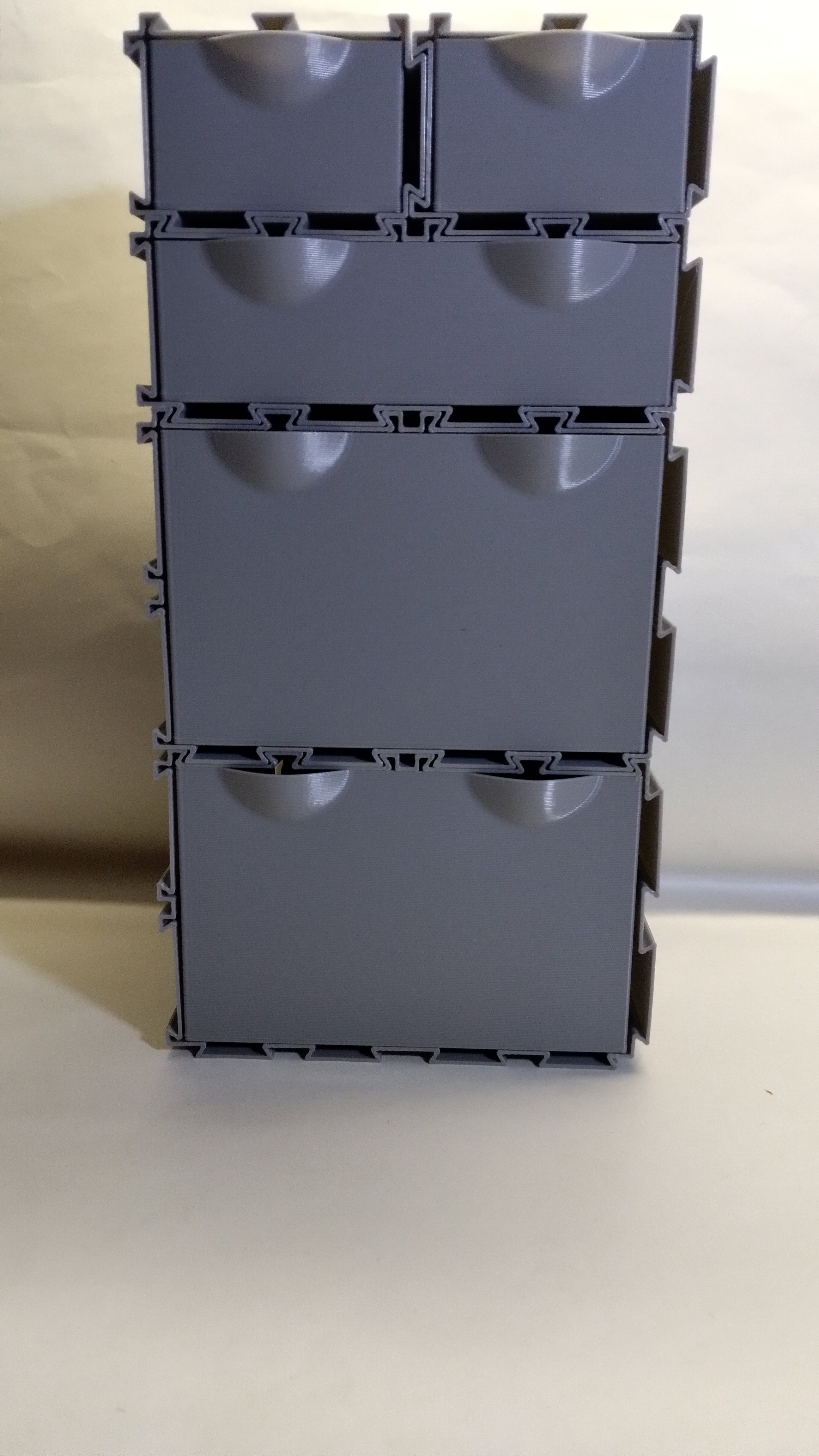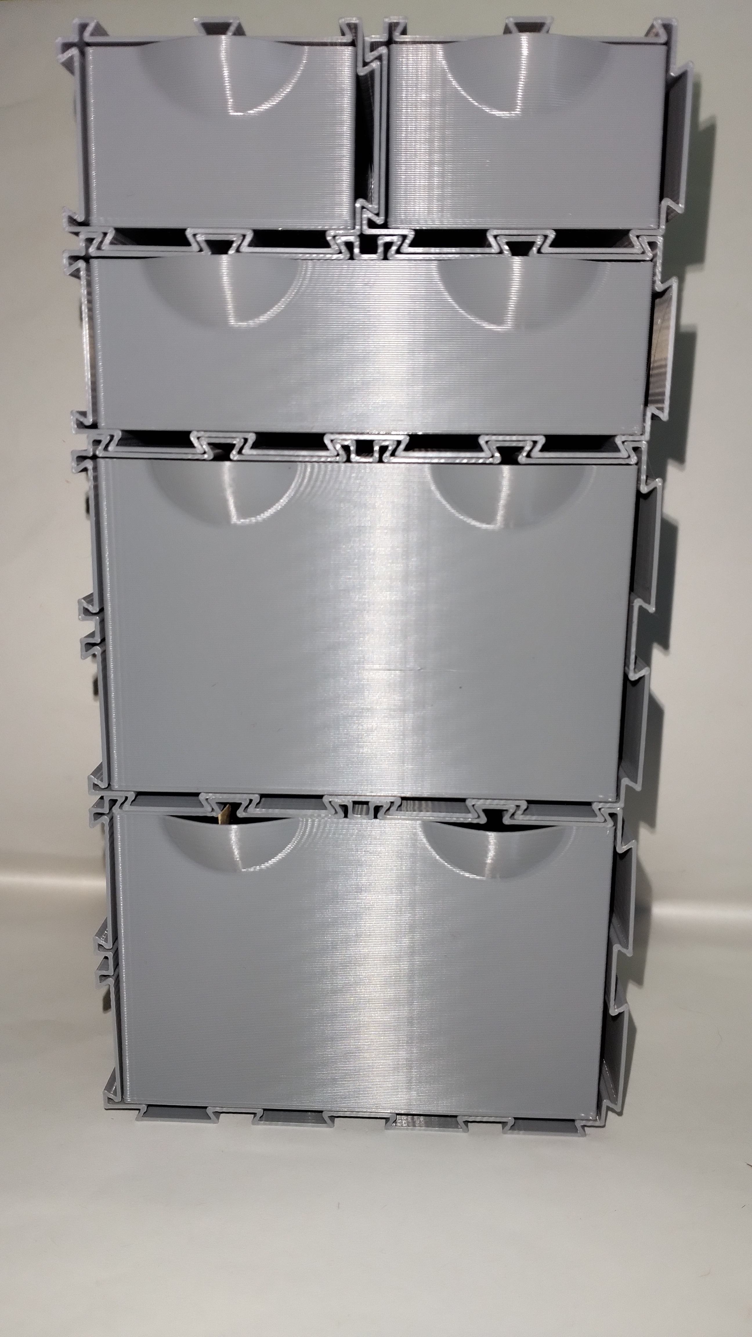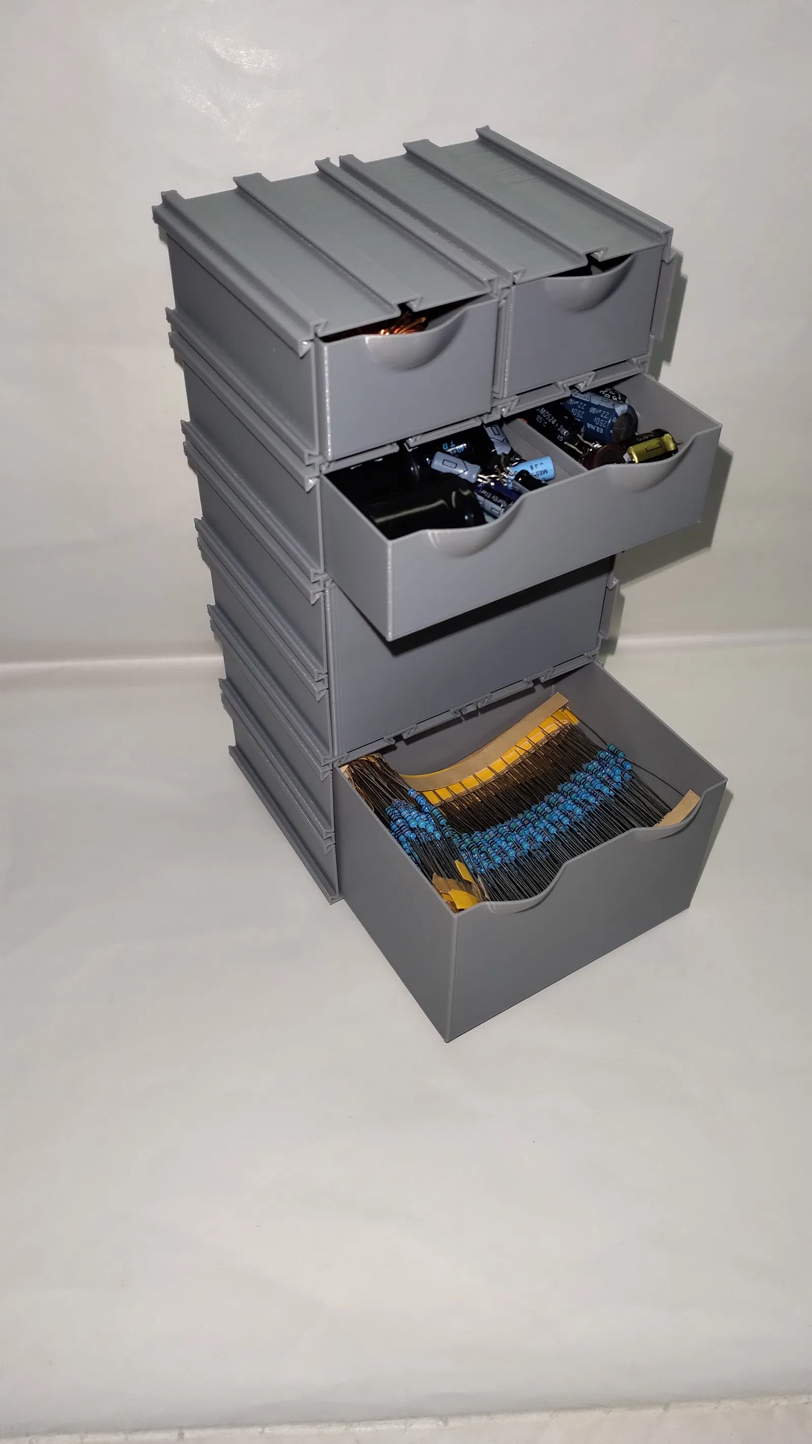 Thiết kế ngăn kéo dạng module in bằng "vase mode", lý tưởng để chứa các linh kiện điện tử như điện trở, tụ điện, IC. Kích thước mẫu đơn 40x25x70mm, có thể tùy chỉnh để phù hợp với nhu cầu lưu trữ.