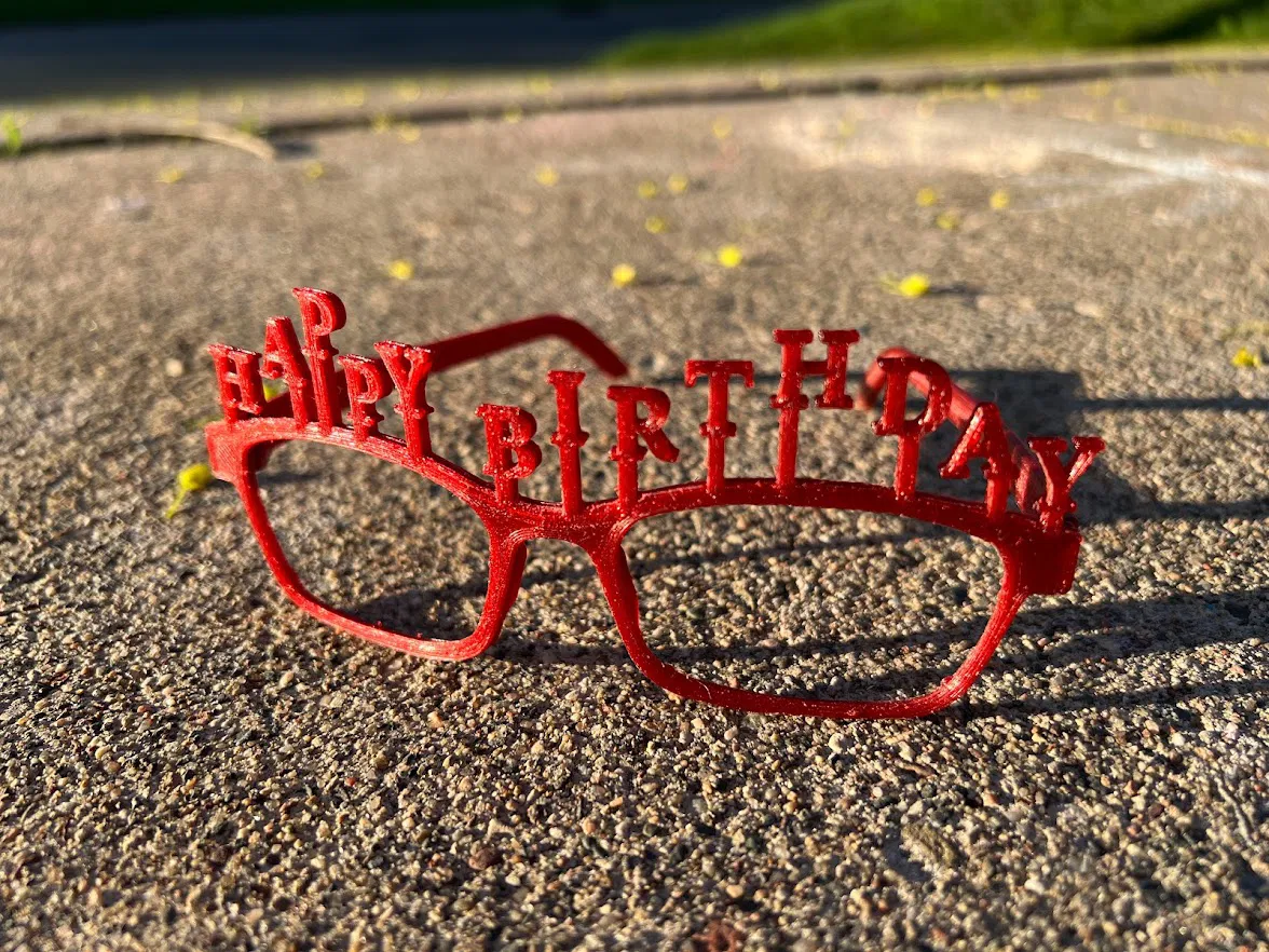 Kính Chúc Mừng Sinh Nhật. Tác giả muốn làm sinh nhật con trai đặc biệt nên đã tùy chỉnh mẫu kính này bằng Tinkercad. Hướng dẫn in chi tiết và bản phối lại có tay cầm cũng được cung cấp.