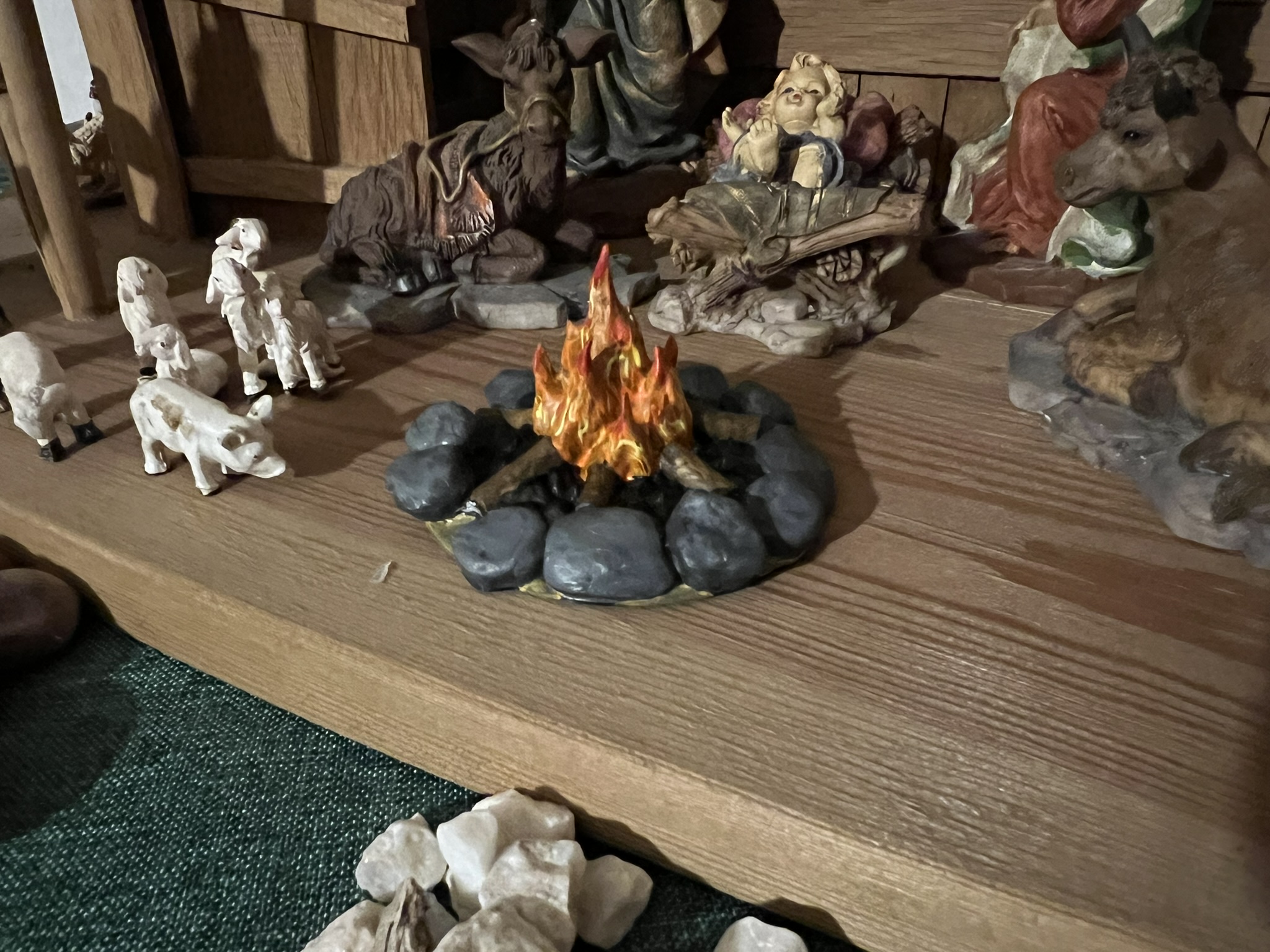 Tụi mình không tìm được chỗ đốt lửa nào ưng ý cho máng cỏ nên đã tự tay làm một cái thiệt lẹ, chi tiết: đá, lửa, ngọn lửa, bùng cháy, nóng, máng cỏ, chúa giáng sinh, đốt, lửa trại.