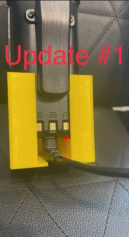 Model được mở ở phía sau và nhấc bộ đàm lên khỏi nút bấm để có thể kết nối cáp sạc góc 90 độ USB-C vào pin khi bộ đàm đang ở trên giá đỡ.