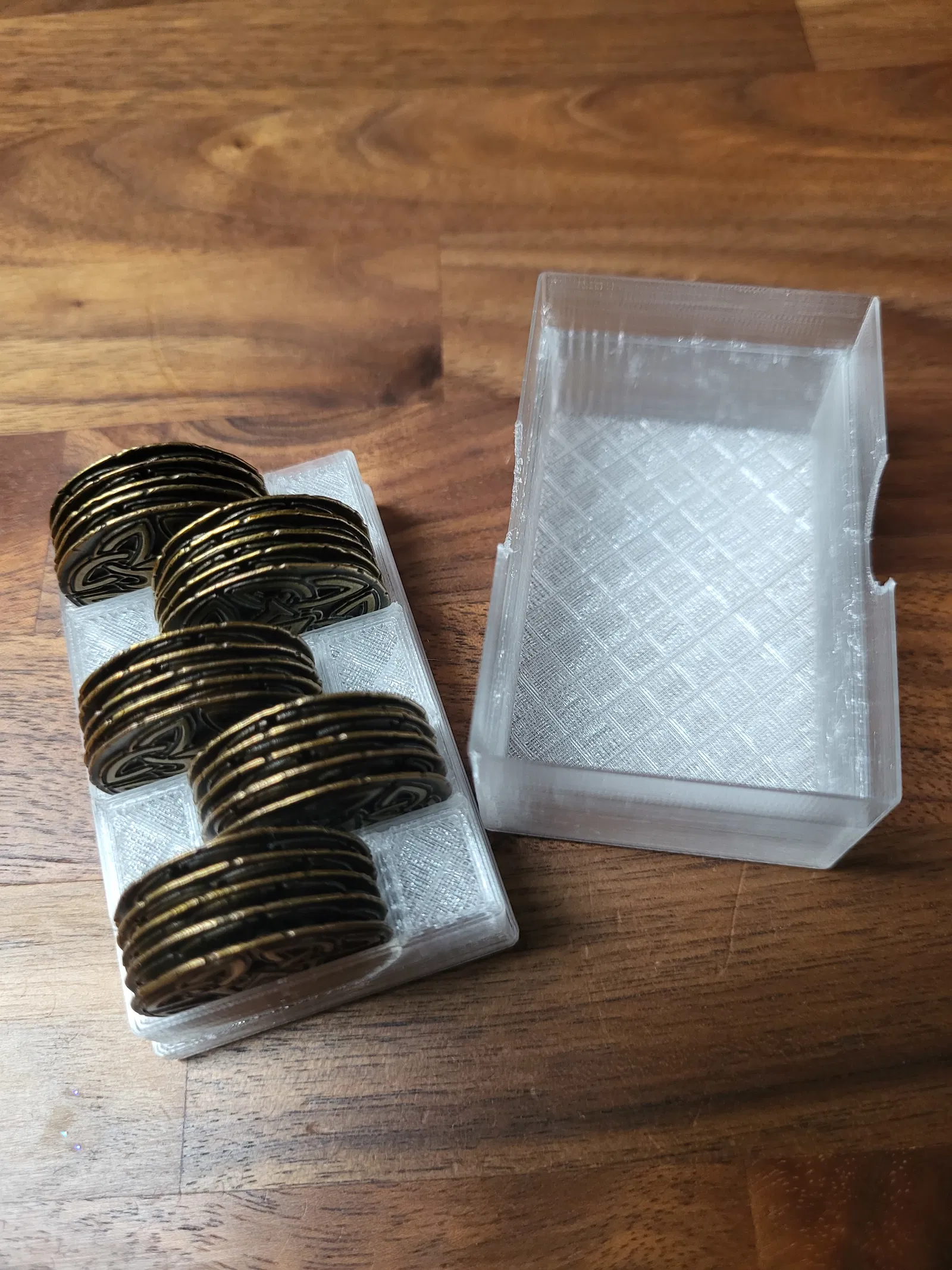 Hộp đựng vừa vặn được thiết kế đặc biệt cho đồng xu "Wizard Deluxe", giúp bảo vệ và sắp xếp chúng gọn gàng trong hộp trò chơi gốc. Hộp có 5 ngăn, tương thích với đồng xu đường kính 26mm và dễ dàng in ấn không cần hỗ trợ. Sắp xếp trò chơi nhanh chóng và ngăn nắp!