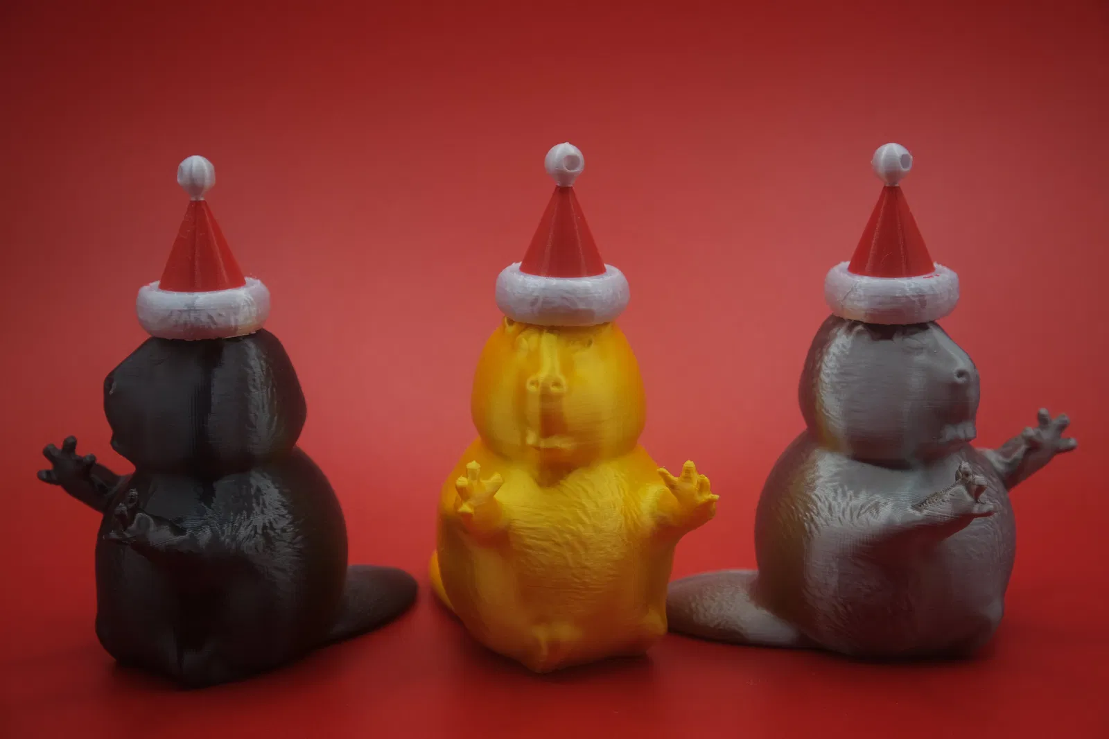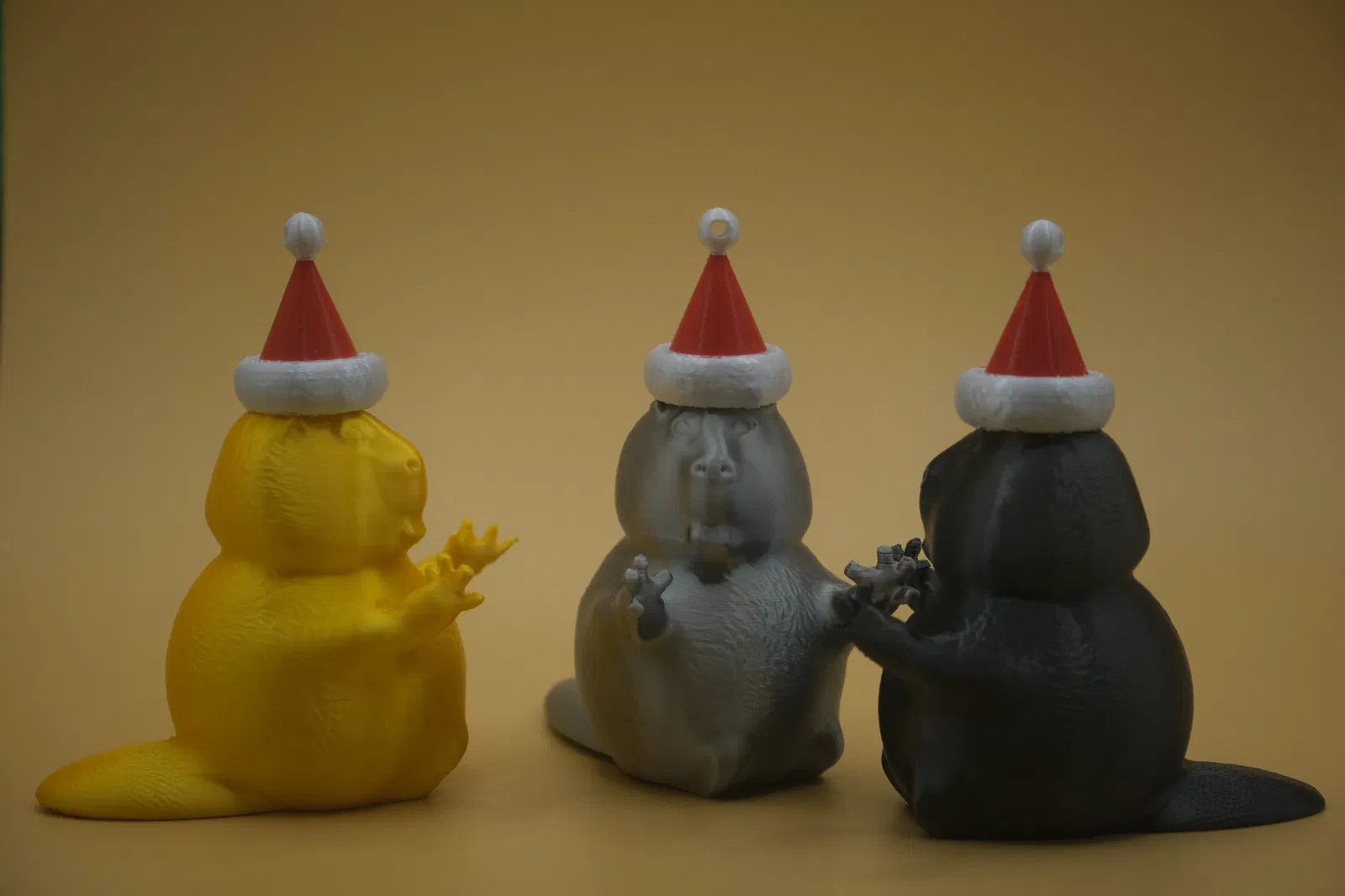 Mô hình hải ly đội nón Giáng Sinh dễ thương, có thể tự đứng hoặc treo lên. Bản thiết kế có tùy chọn nón với diện tích tiếp xúc lớn hơn để dễ dán. Cần support cho nón, nhưng hải ly thì không cần nếu in với layer height 0.15mm trở xuống.