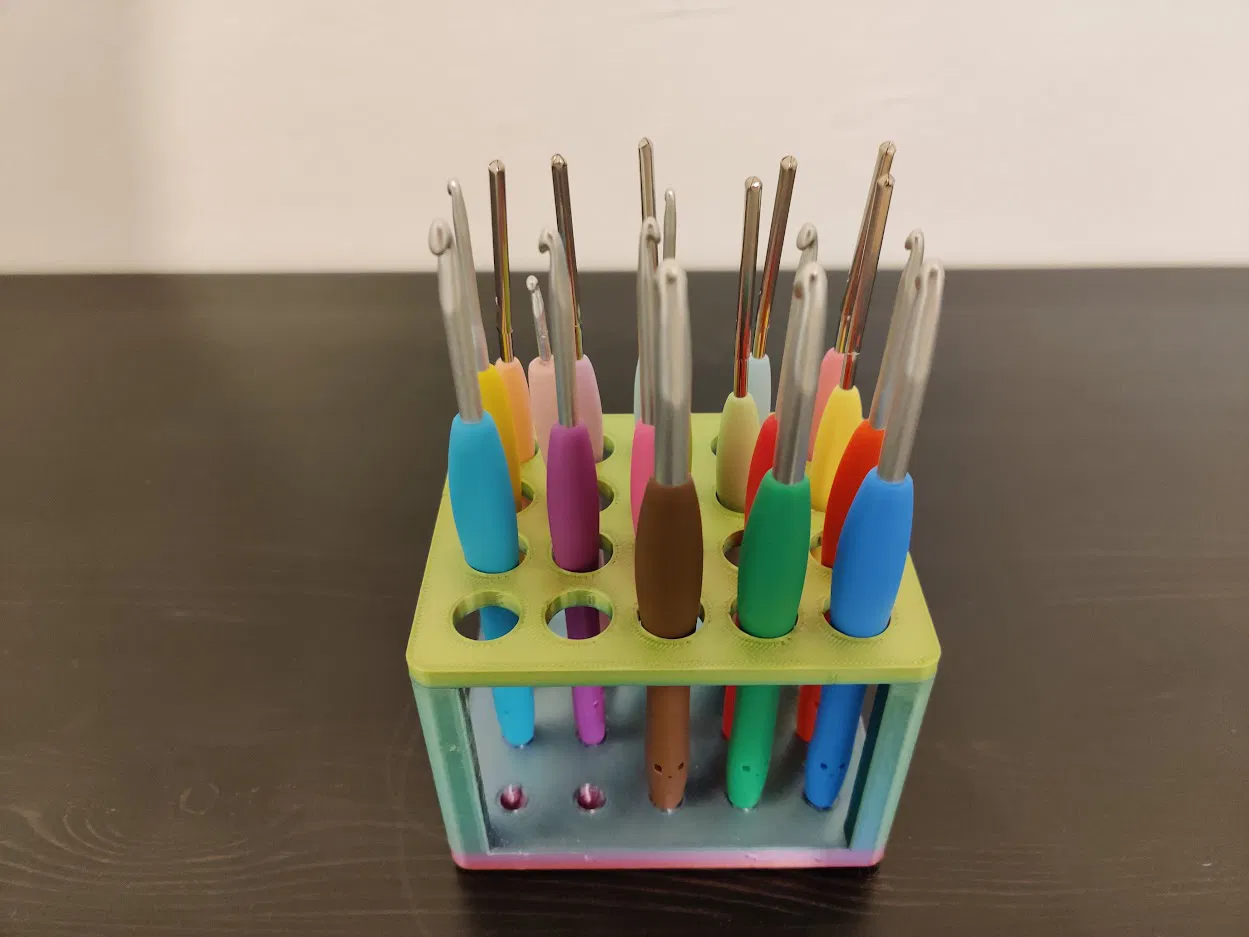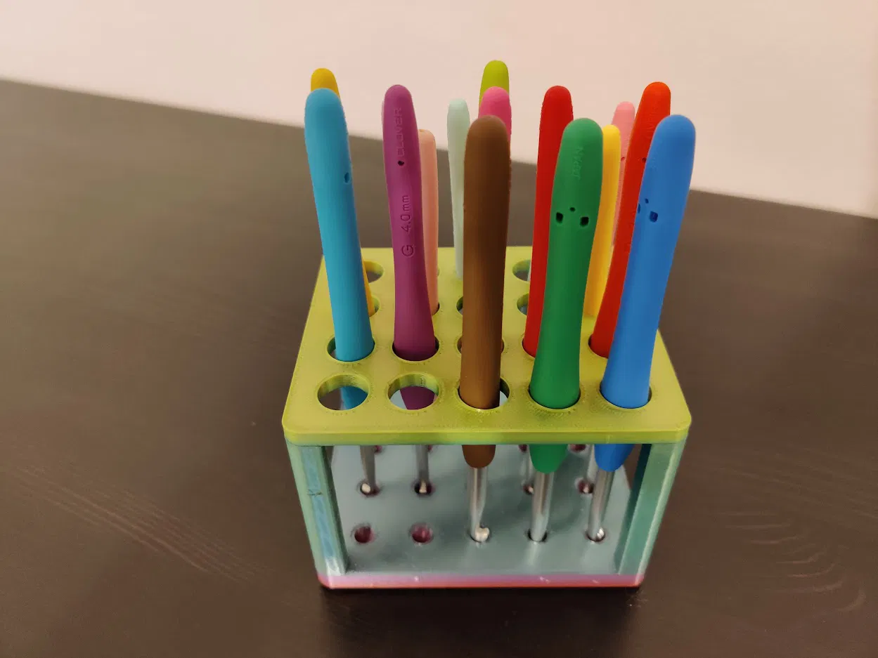 Hộp đựng 20 cây kim móc len. Có thể dùng để đựng bút. Sản phẩm in 3D với PLA, không cần support, dễ dàng lắp ráp bằng cách dán hai phần lại.