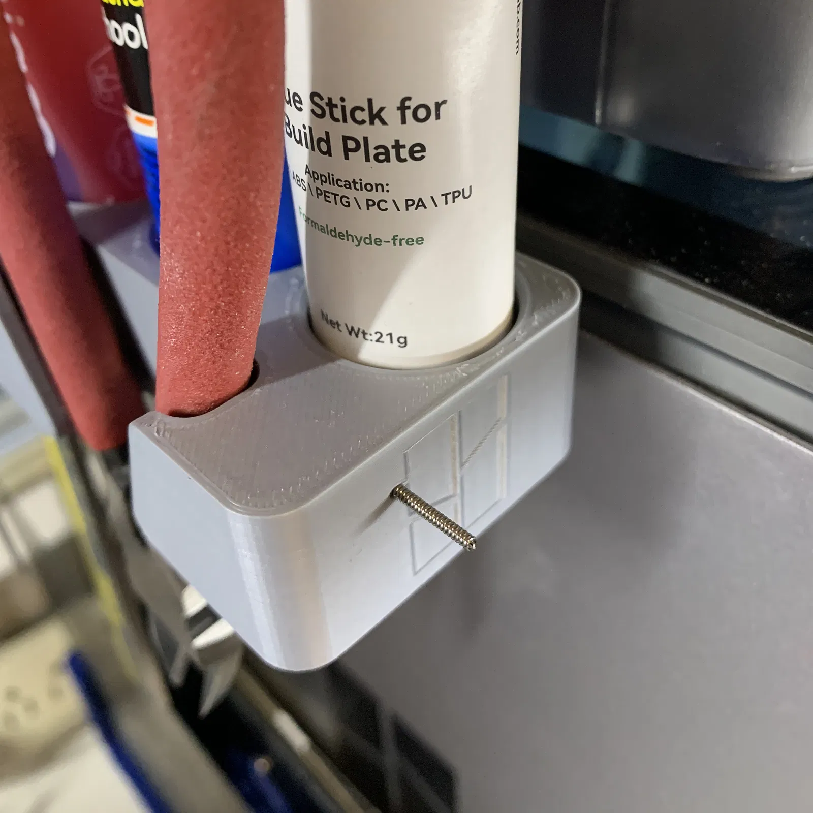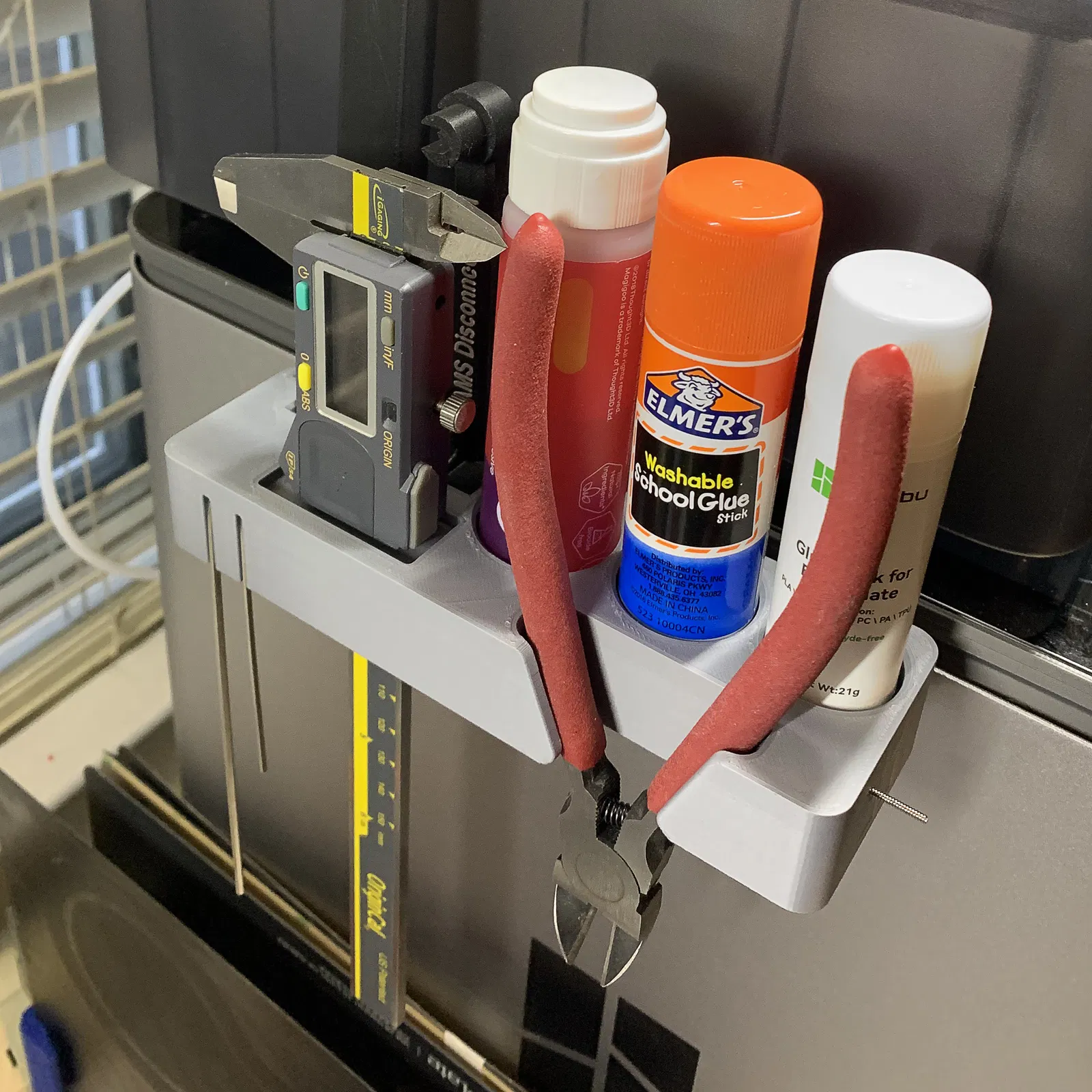In 2 phần. Cái kẹp trượt vào khe trống bên trái của AMS. Phần kẹp với cái giữ đồ chính nên vừa khít. Cần hơi mạnh tay chút nha. Phần gắn vào AMS nên trượt hết cỡ và vừa chặt nhưng không cần phải ép. Chứa được: Kềm cắt Thước cặp Magigoo Keo dạng thỏi Elmer's Keo dạng thỏi Bambu Lab Lục giác 2.5mm Lục giác 1.5mm Dụng cụ ngắt kết nối AMS (Bambu AMS Disconnect Tool by Jody | Download free STL model | Printables.com) Dụng cụ cạo Bambu Kim vệ sinh đầu phun 0.4mm
