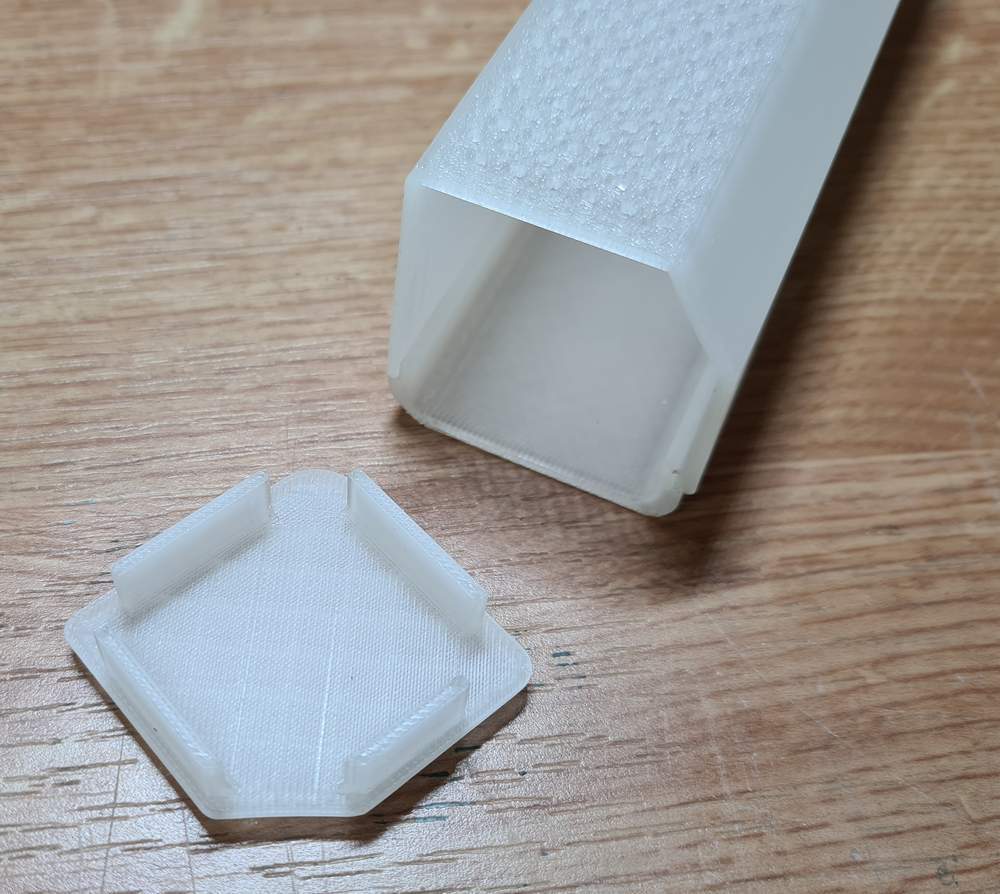 Cái hộp hút ẩm in 3D này gồm 3 bộ phận, in bằng filament trong suốt nha. Đáy và nắp thì dán lại với nhau bằng vài giọt keo CA.