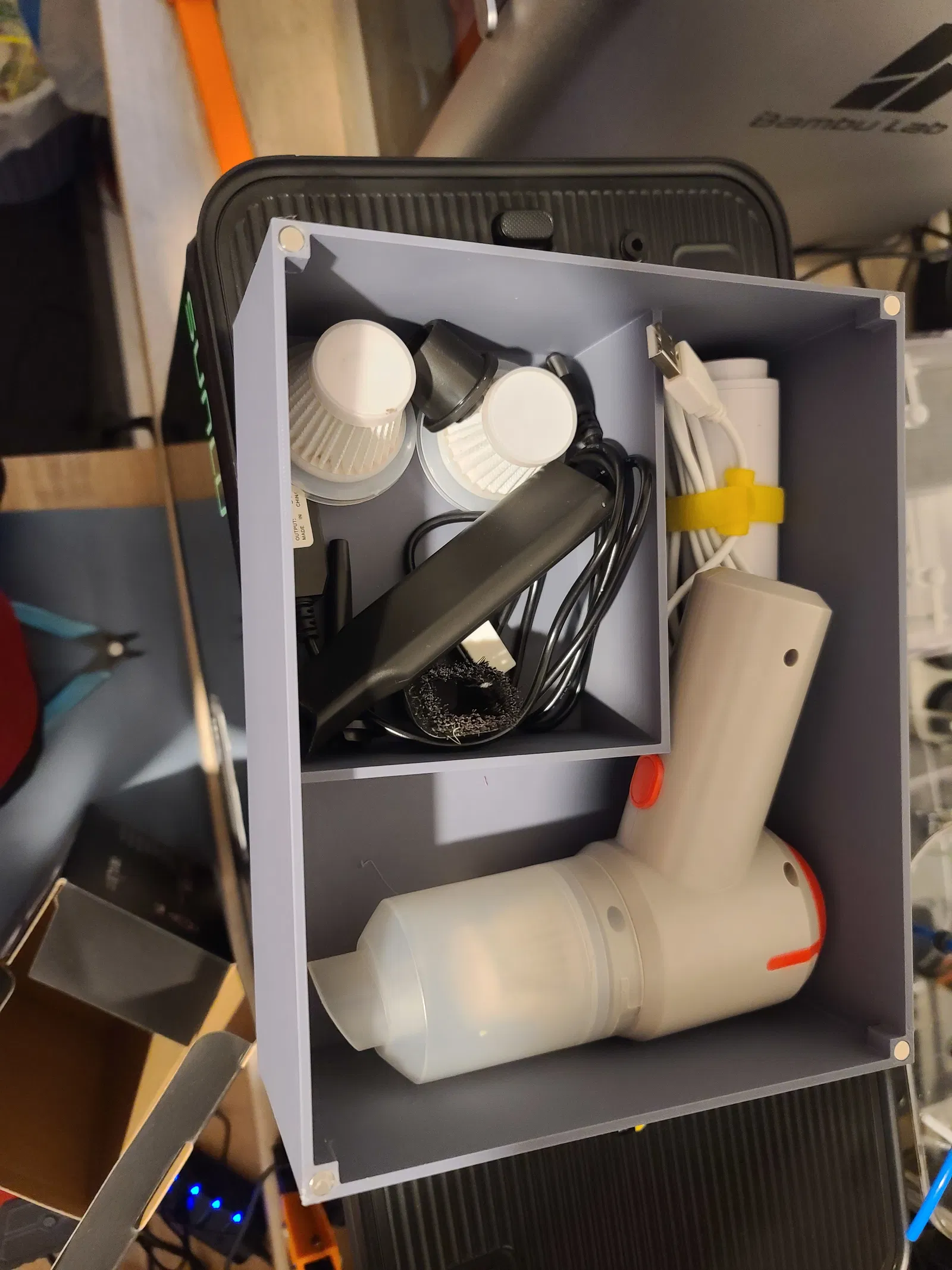 Tui mới mua một cái máy hút bụi sạc bằng USB từ Amazon, để dọn mấy vụn filament, và muốn có chỗ để cất nó.