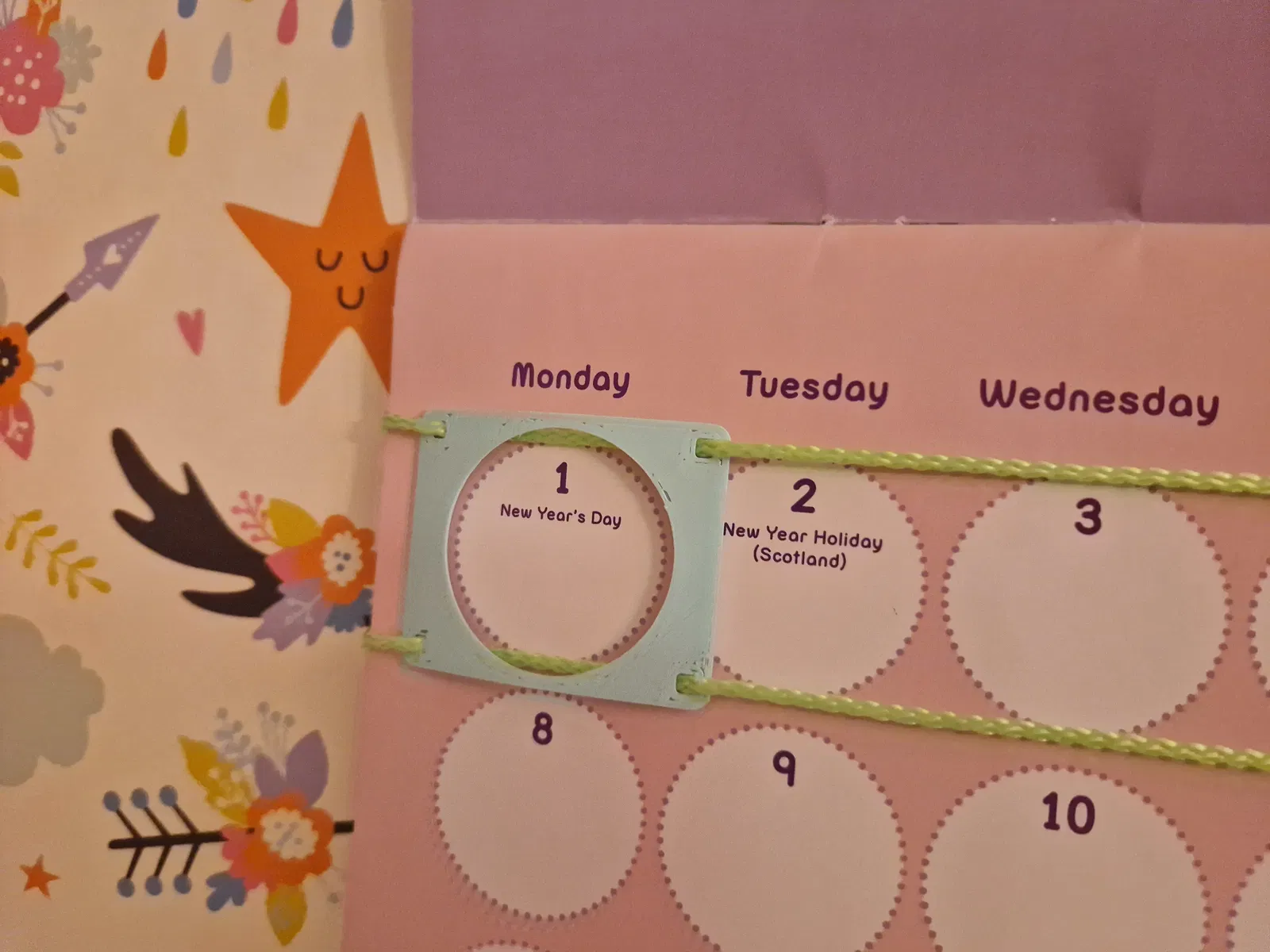 Dùng một sợi dây để nối tất cả các bộ phận lại với nhau và dùng dây thun để căng dây ở phía sau lịch (xem hình). Cái ô xem ngày nên trượt trên dây và độ căng không nên quá mạnh (nếu không lịch sẽ không nằm phẳng).