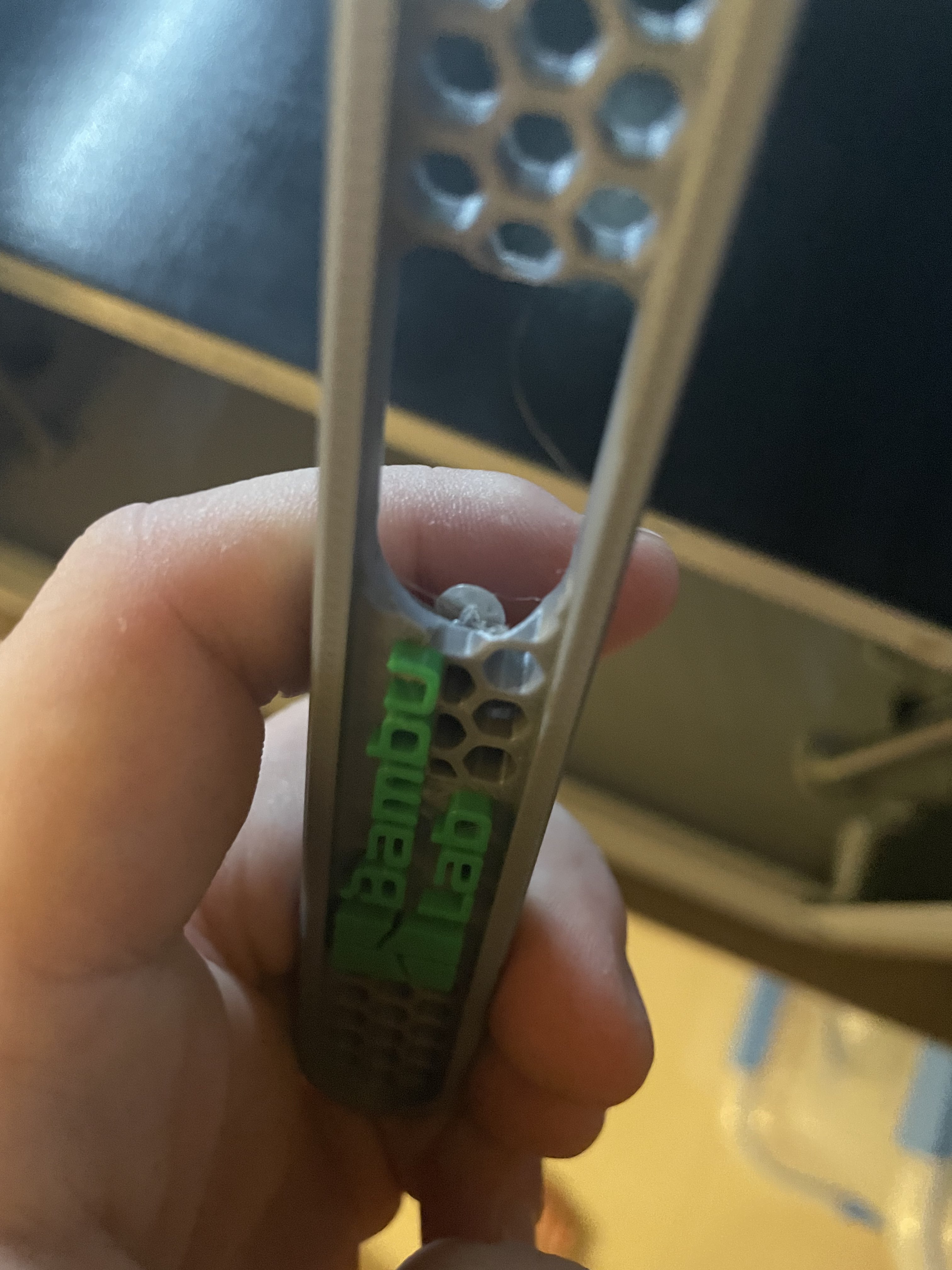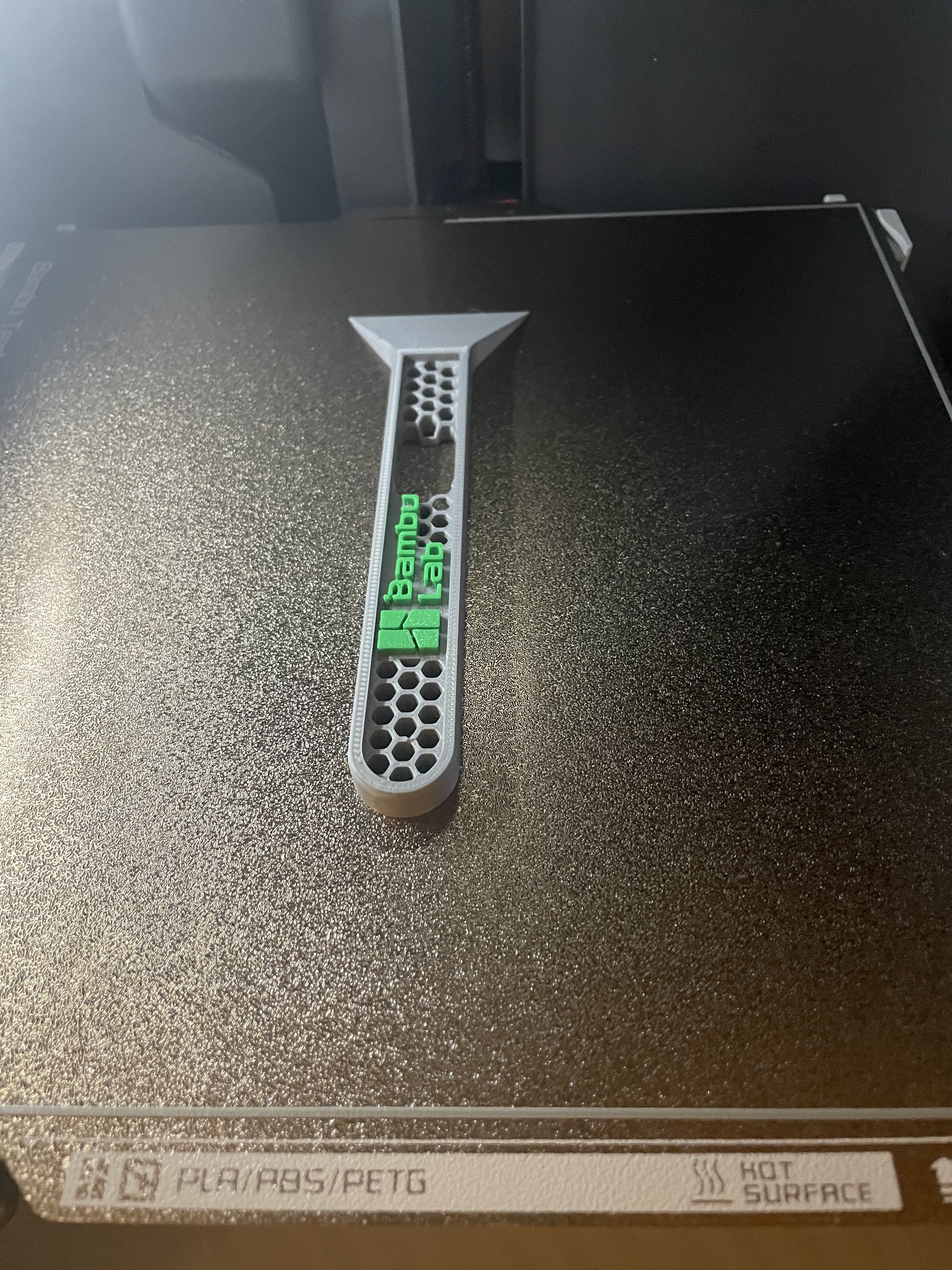 Thế là sau khi lướt qua RẤT NHIỀU loại scraper, tôi ngồi xuống và kết hợp hoa văn hình lục giác (thật ra là nó nhìn đẹp thôi) với logo Bambu Lab và sửa lại kích thước. Ban đầu tôi chỉ định dùng nam châm để gắn nó vào bên hông máy, cho đến khi nhận ra nó làm bằng nhôm nên không có từ tính. Vì vậy, sau vài phép đo nhanh, tôi khoét một lỗ xuyên qua các hình lục giác, rồi nhận ra thêm 3 điều nữa. Điều đầu tiên là tấm kính đã chặn cái scraper thử nghiệm gắn vào máy (ôi, đáng lẽ tôi phải nhận ra điều này). Thứ hai là tôi cần một cái lỗ lớn hơn phần bên trong của tay nắm, vì khi gắn vào nó sẽ nằm chéo. Cuối cùng, nếu tôi tăng kích thước của phần cạo, tôi có thể dùng nó như một tay nắm cửa lớn hơn! Thêm vài lần tinh chỉnh để đạt được dung sai phù hợp và chúng ta có thứ bạn đang thấy, một cái scraper… có lỗ. Đúng vậy, thiết kế hơi quá đà, thậm chí tôi còn cố gắng thêm vài cái chân nhỏ để scraper tự cố định. Rõ ràng là không cần thiết vì nó đã CỰC KỲ ôm khít ngay từ đầu, nên bạn có thể chọn giữ lại chúng hoặc dùng phiên bản không có.