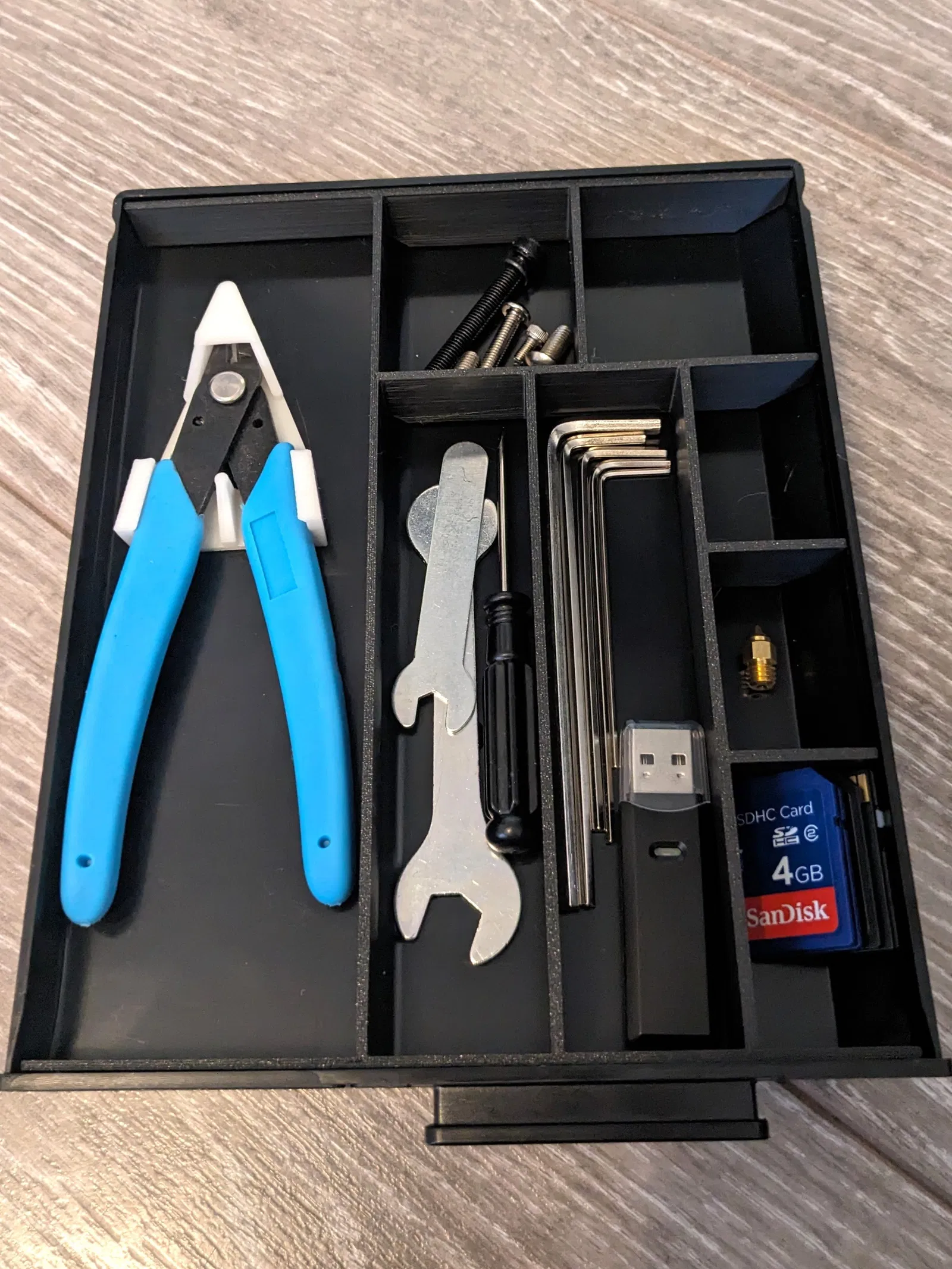 Khay đựng đồ nghề Ender 3 S1 Pro (Bản Remix) là bản chỉnh sửa từ mẫu gốc trên Printables. Giúp bạn sắp xếp dụng cụ gọn gàng hơn. In bằng PLA với độ phân giải 0.20 mm và ruột 20%.