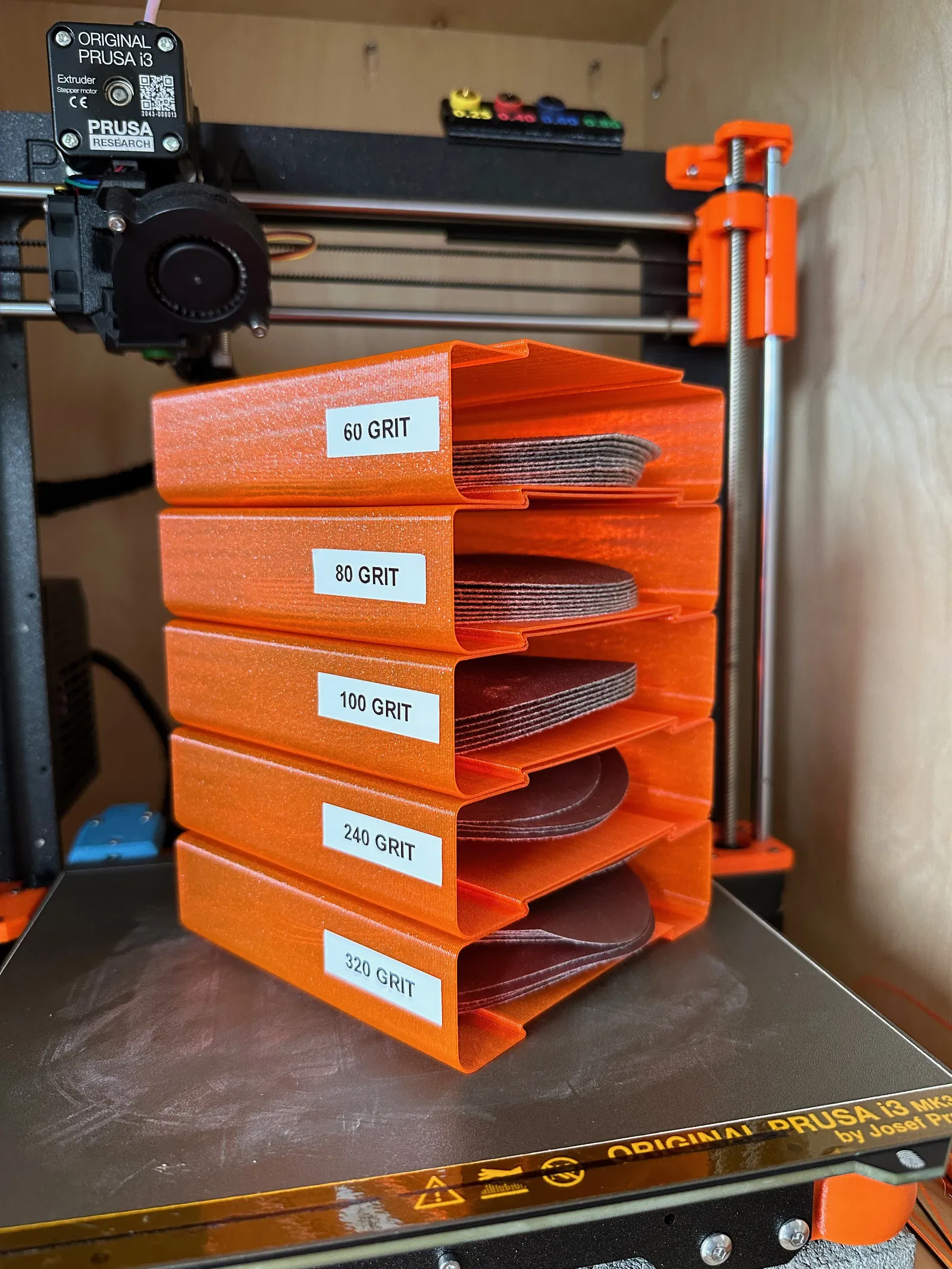 Giả sử bạn chỉ có 3 loại độ nhám đĩa chà nhám. Hãy in 3 cái hộp nhỏ này! Mua thêm một loại nữa? In thêm một cái nữa! Bộ phận có rãnh ghép nối dạng đuôi én để bạn có thể ghép module tiếp theo vào vị trí.