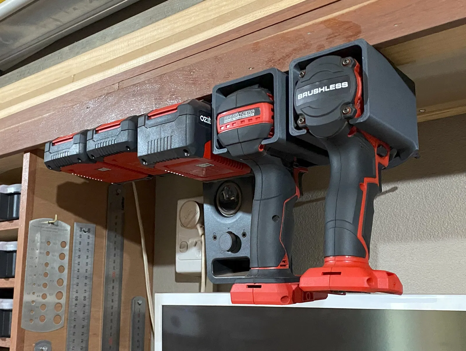 Giá đỡ/bộ gắn phía trên cho máy khoan Ozito, máy siết bu lông và pin. In không cần support, dùng được với hầu hết các loại sợi in như CF PLA. Có kèm miếng đệm cho bề mặt có gờ. File Fusion đi kèm.