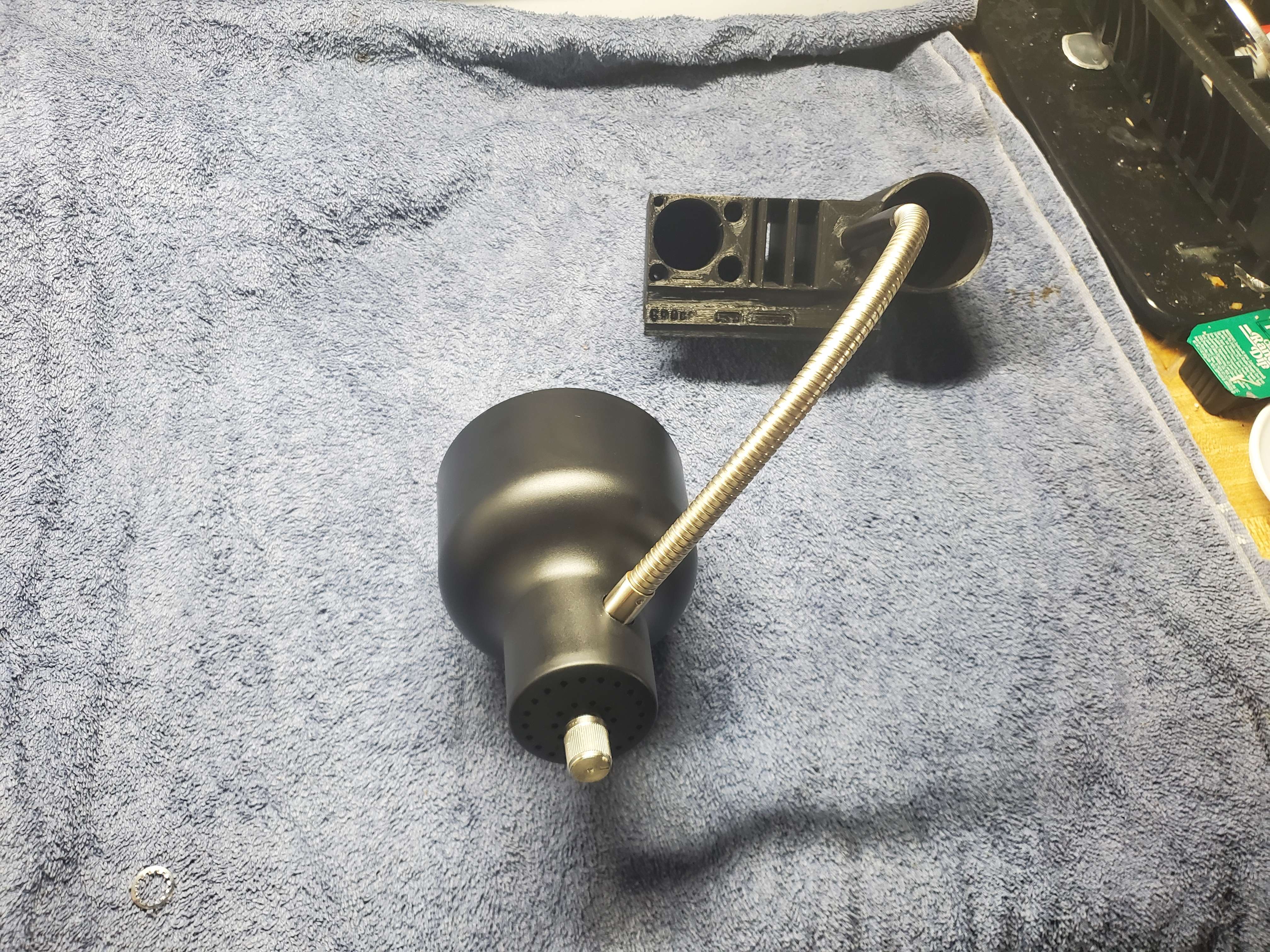 Tôi đã tháo đế và cắt dây từ cổ ngỗng gần chỗ bấm dây nhất có thể. Tôi luồn dây nguồn qua mặt sau của lỗ ren trên mẫu, tách 2 sợi dây và luồn ống co nhiệt qua mỗi nhánh. Tôi hàn các dây lại với nhau theo cực tính ban đầu và dùng máy sấy làm nóng ống co nhiệt để bảo vệ mối hàn và kim loại trần. Tôi luồn dây trở lại qua lỗ và vặn ống đèn vào.