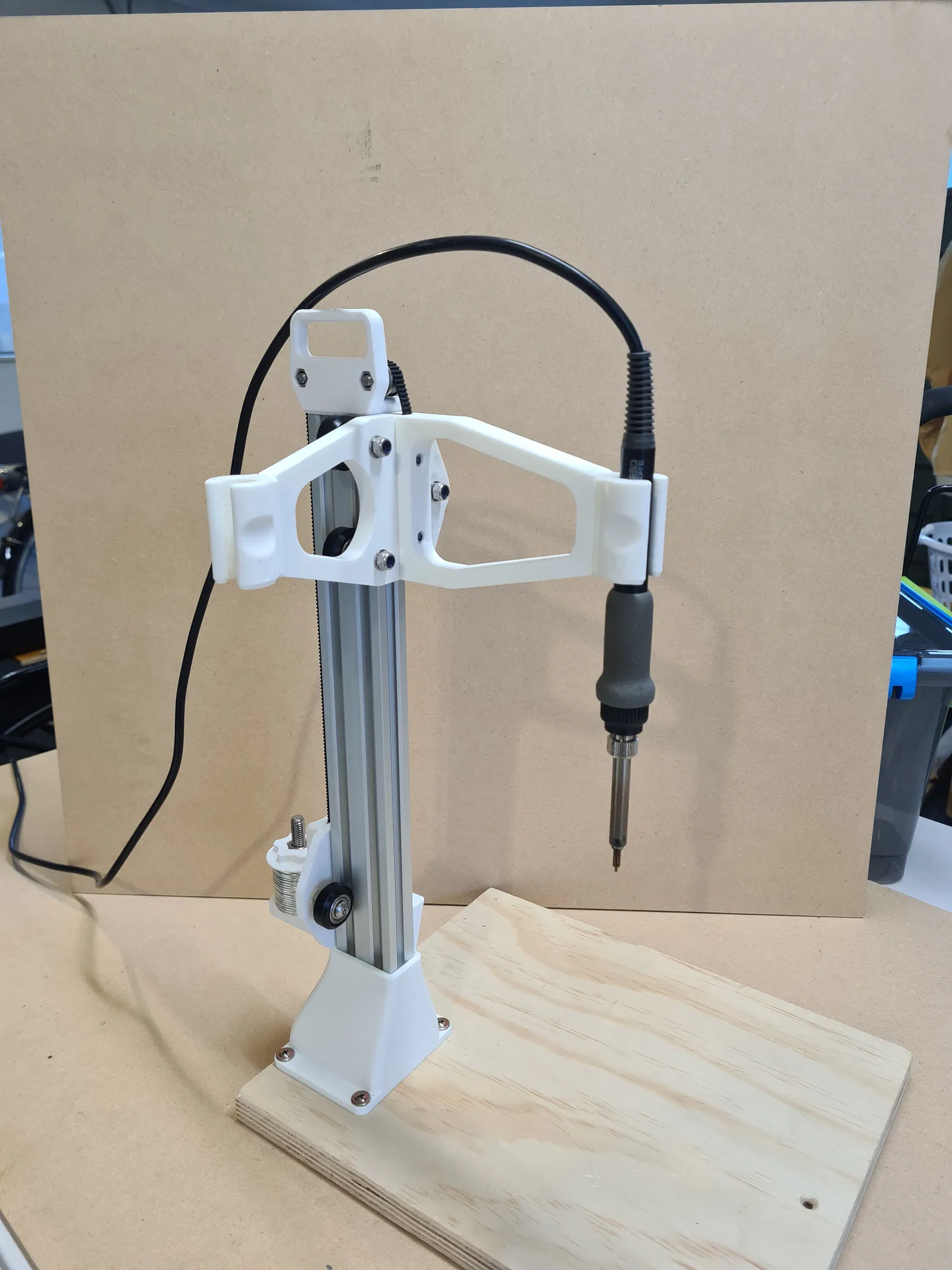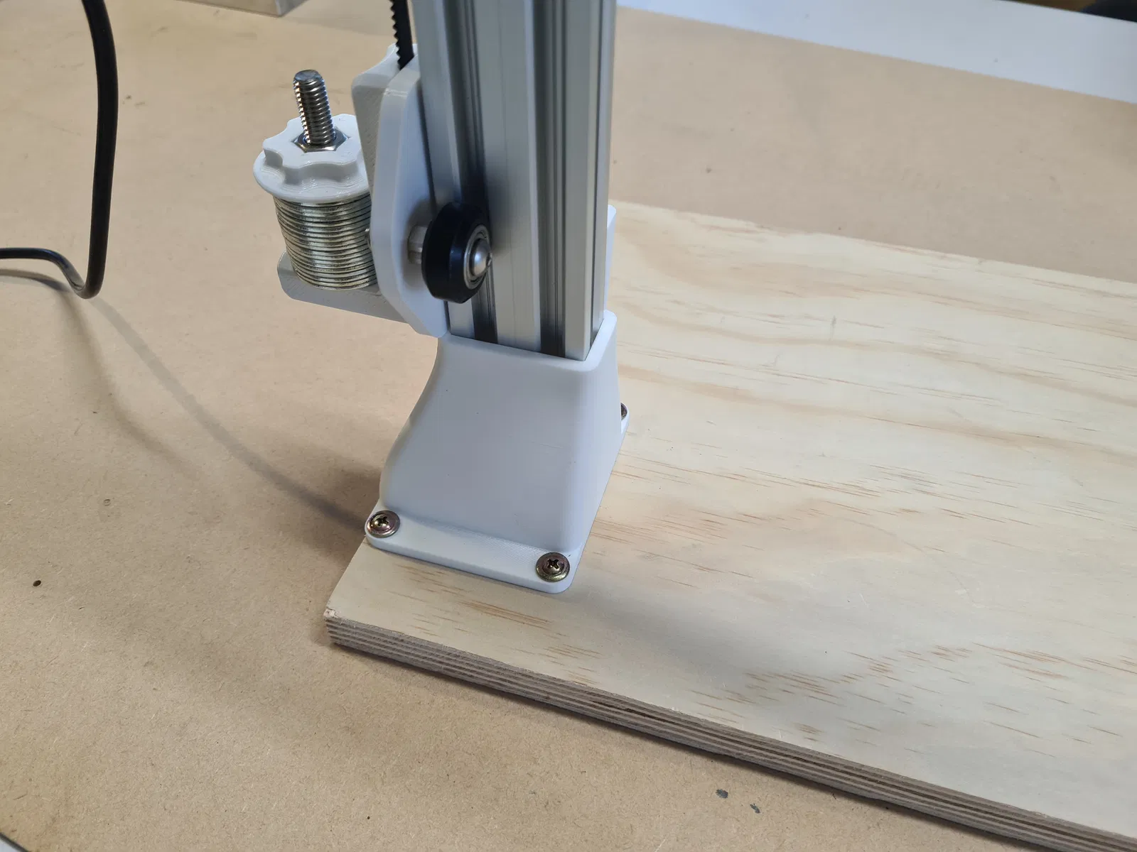 Mod thứ hai là đế bắt vít. Điều này cho phép bạn gắn công cụ vào một miếng ván ép (hoặc tương tự), rất tiện lợi nếu bạn không có bề mặt phẳng đẹp để làm việc. Nó cũng nâng thanh nhôm lên khoảng 55mm, tạo thêm chiều cao.