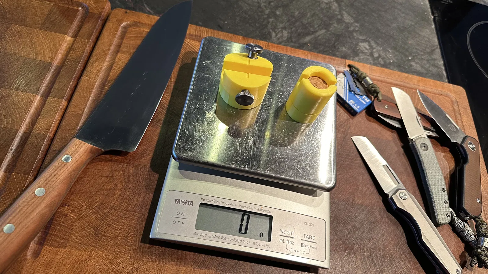 Thiết bị này, một bản remix của Edge Sharpness Tester, giúp xác định độ sắc của lưỡi dao bằng cách đo trọng lượng cần thiết để cắt sợi chỉ nhựa. Phiên bản này có điều chỉnh kích thước, tích hợp nam châm và điểm tựa bảo vệ lưỡi dao, sử dụng nút rượu vang hoặc nam châm.