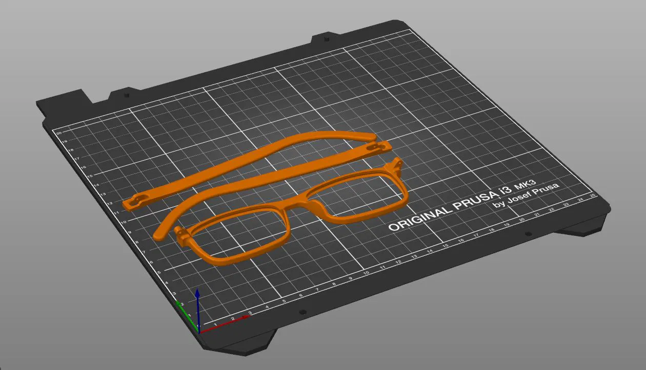 In các bộ phận như trong ảnh chụp màn hình slicer, rồi ráp chúng lại với nhau. Cẩn thận nhét tròng kính của bạn vào gọng, chúng sẽ vừa khít. Có thể bạn sẽ cần in lại vài lần để có được cái vừa ý.