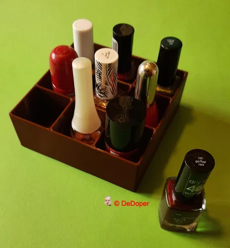 Một chiếc khay đơn giản giúp bạn sắp xếp và cất giữ các chai sơn móng tay một cách gọn gàng, có đến 9 ngăn tiện lợi.