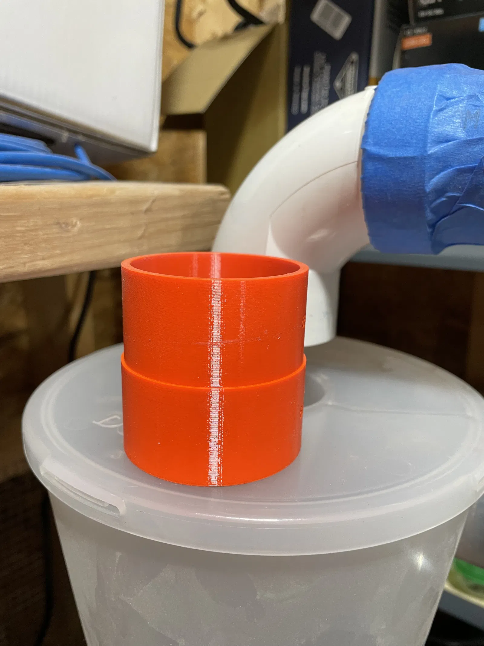 Dùng cái này để nối máy hút bụi ShopVac vào khớp nối PVC, hỗ trợ thu gom bụi gỗ trong xưởng. Adapter này dùng được cho nhiều loại máy hút bụi và khớp nối PVC, kể cả Oneida Dusty Deputy. In với infill 15% và tốc độ 0.4 trên máy MK4.