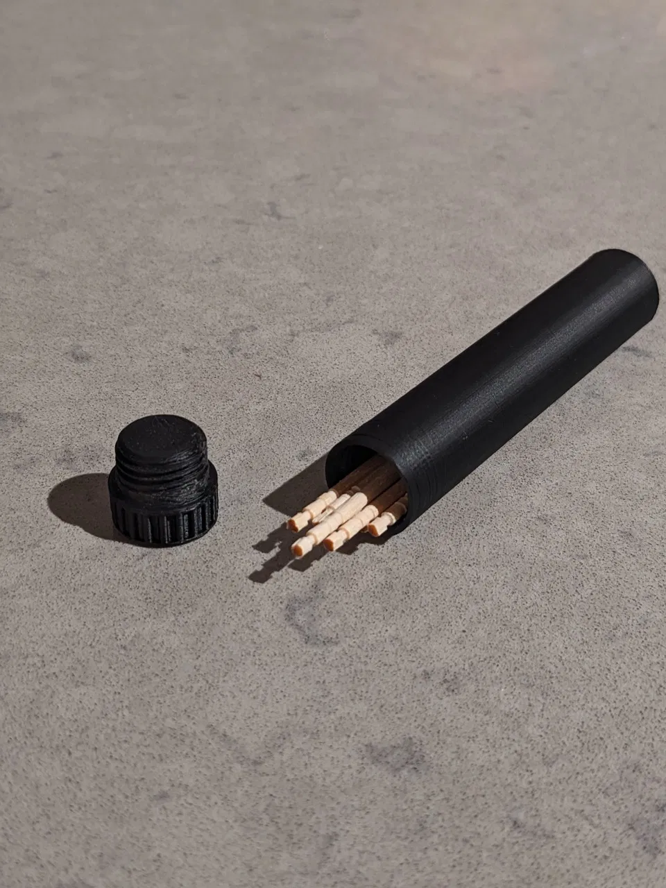 Hộp đựng tăm có nắp vặn, in không cần hỗ trợ. Ren được thiết kế có khoảng hở nên không cần chỉnh sửa. Chứa vừa tăm dài 65mm. Chất liệu PLA, file STL.