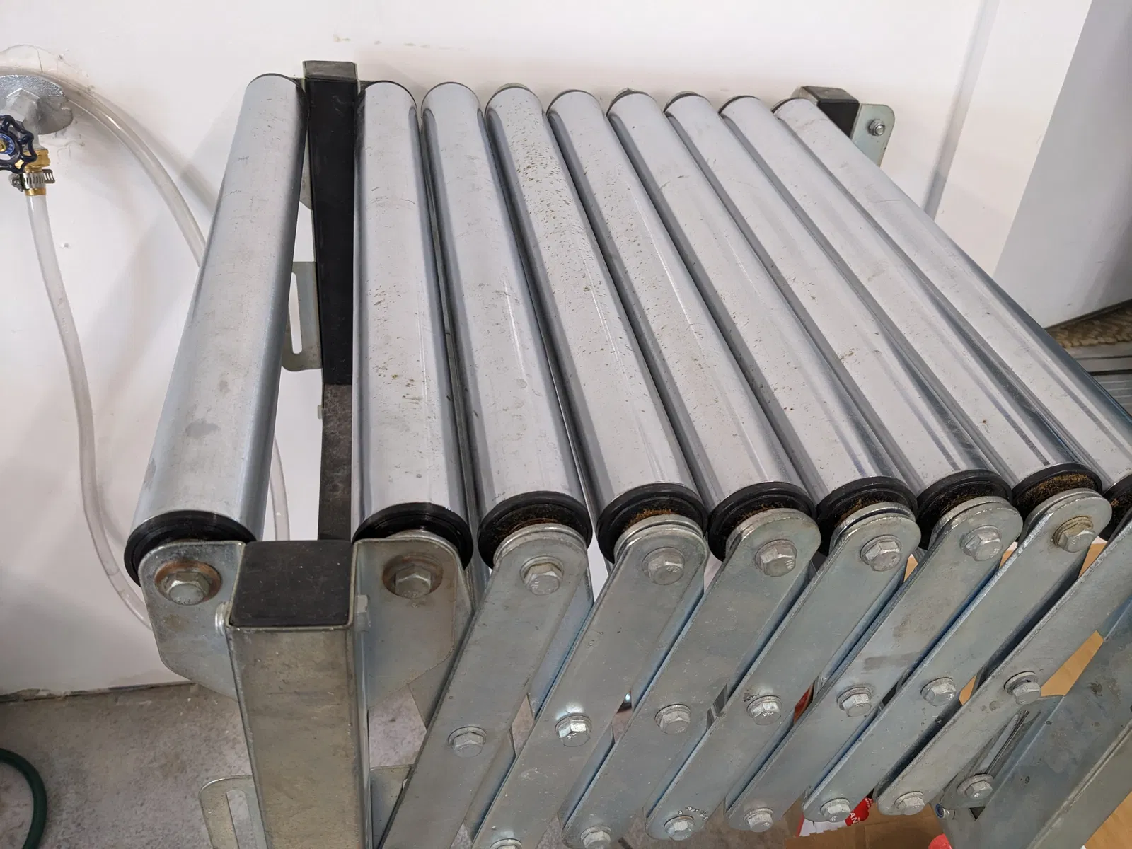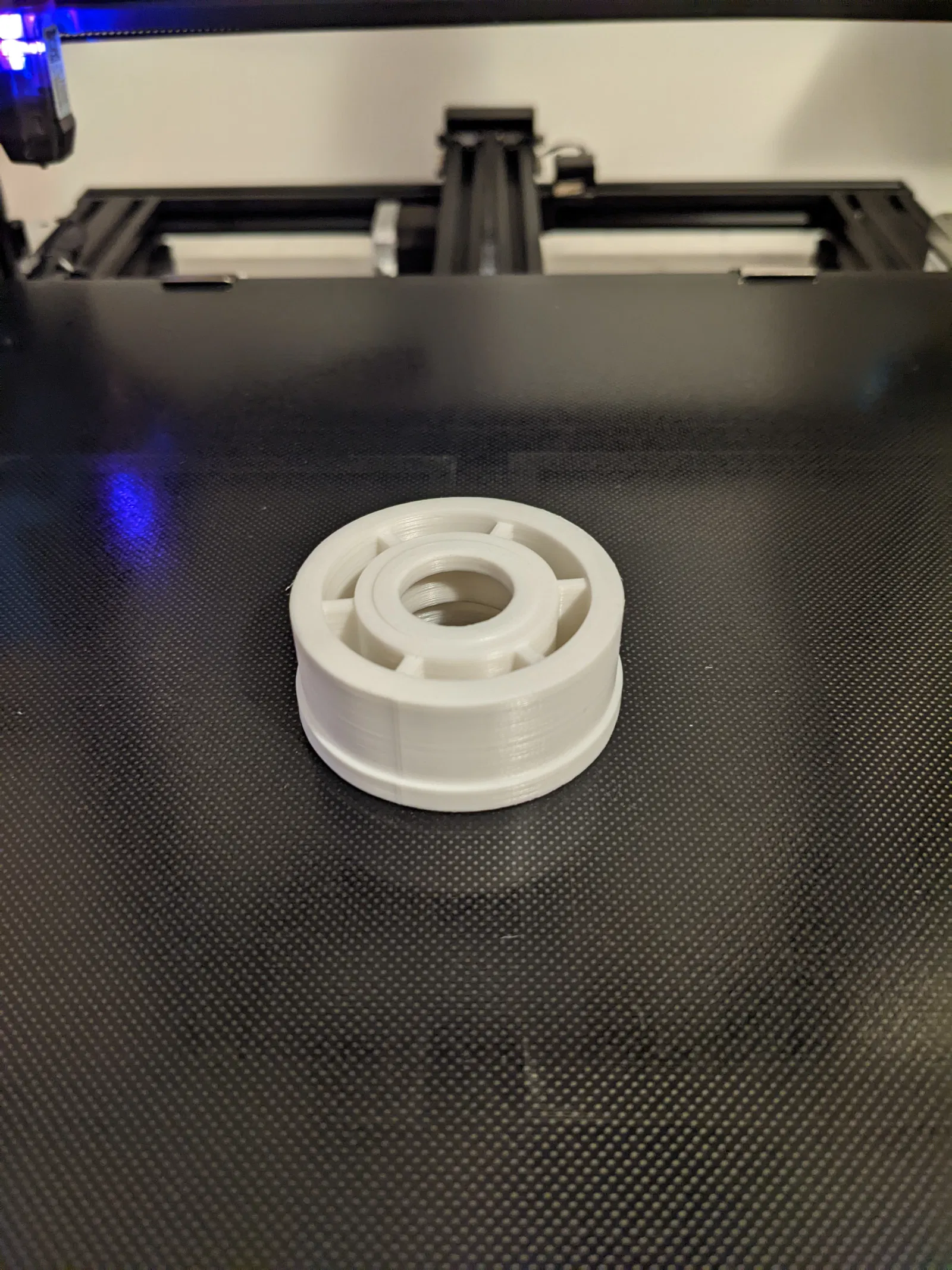 Bố vợ tôi có một cái bàn đỡ có thể mở rộng để đỡ các khúc gỗ dài sau khi cắt ra khỏi máy cưa bàn. Về cơ bản nó gồm bốn chân có bánh xe, nối với nhau bằng một loạt khớp cắt kéo có con lăn ở trên cùng. Nó khá vững khi mở rộng nhưng lại dễ bị đổ khi thu gọn lại. Có lần nó bị đổ và bộ phận nhựa định tâm con lăn trên ổ bi đã bị gãy ở một trong các con lăn ở đầu. Tôi đã tận dụng cơ hội này để học OpenSCAD vì nó về cơ bản là một loạt hình trụ được gia cố bằng 6 cánh tỏa tròn.