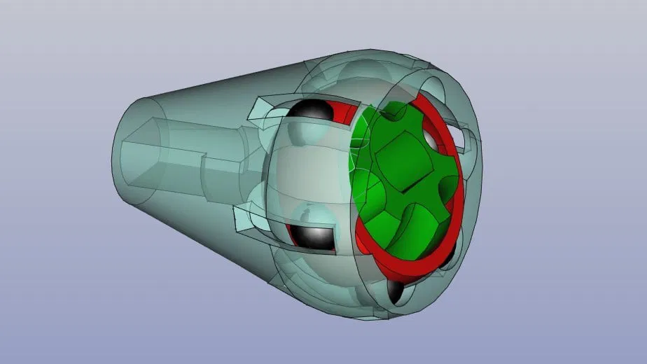 Khớp nối Rzeppa tốc độ không đổi hoạt động, đường kính chỉ 15 mm, có đầu nối cho trục kẹp fischertechnik 4 mm. Yêu cầu 6 bi thép 3mm, cần xử lý sau in cẩn thận để đảm bảo hoạt động trơn tru, ít ma sát nhất.