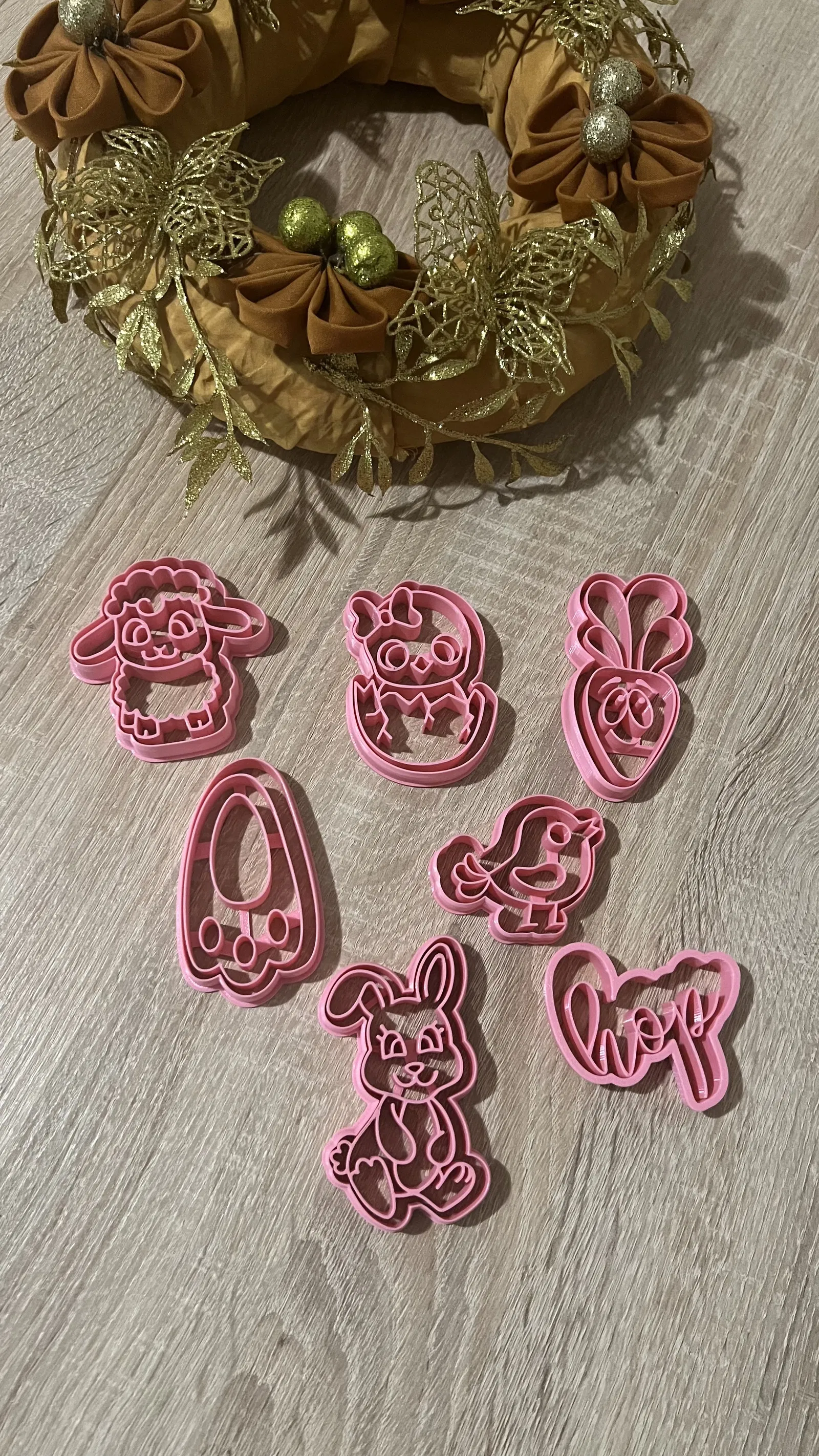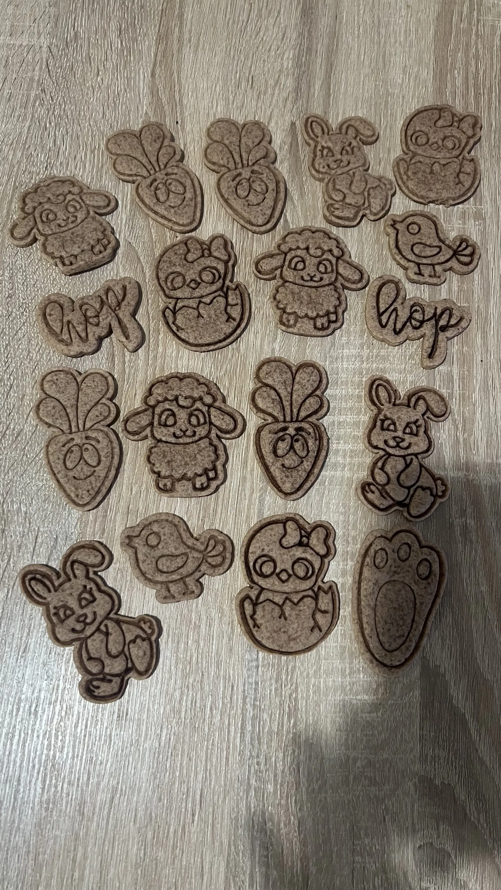 Khuôn cắt bánh quy chủ đề Phục Sinh - thỏ, cừu, cà rốt xinh xỉu, chim nhỏ, chân thỏ, gà trong trứng. Khuôn có 2 phần cắt viền và đóng dấu riêng biệt, dễ in, có thể bật ironing cho phần đóng dấu. Thích hợp cho bếp, làm bánh quy.