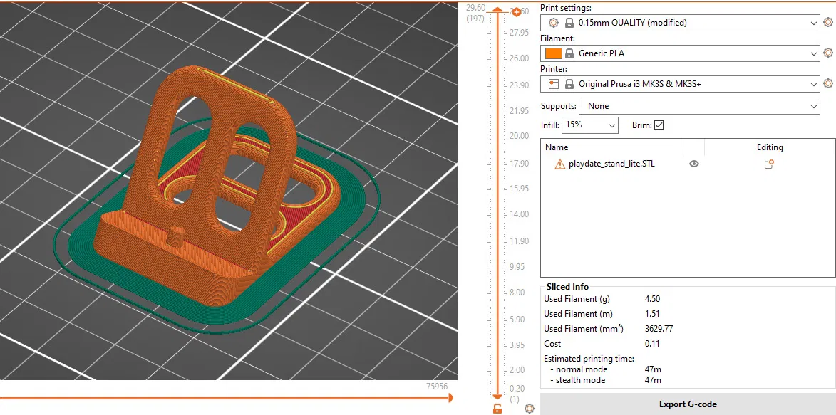 Chân đế trưng bày cơ bản cho máy Playdate, được chỉnh sửa để trông tròn hơn và tiết kiệm nhựa in hơn 40% so với bản gốc. Tối ưu cho in PLA, không cần support.