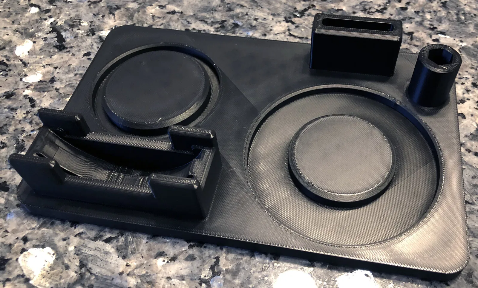 Rồi cho nó gọn gàng, tui dời chỗ để muỗng, cà phê pha bằng máy với cây khuấy qua chỗ khác. Tui cũng khoét sâu thêm 1 mm chỗ để nắp để dễ bỏ vô, lấy ra, bỏ luôn cái tay cầm với giảm chiều cao đế còn 8 mm để tiết kiệm dây nhựa.