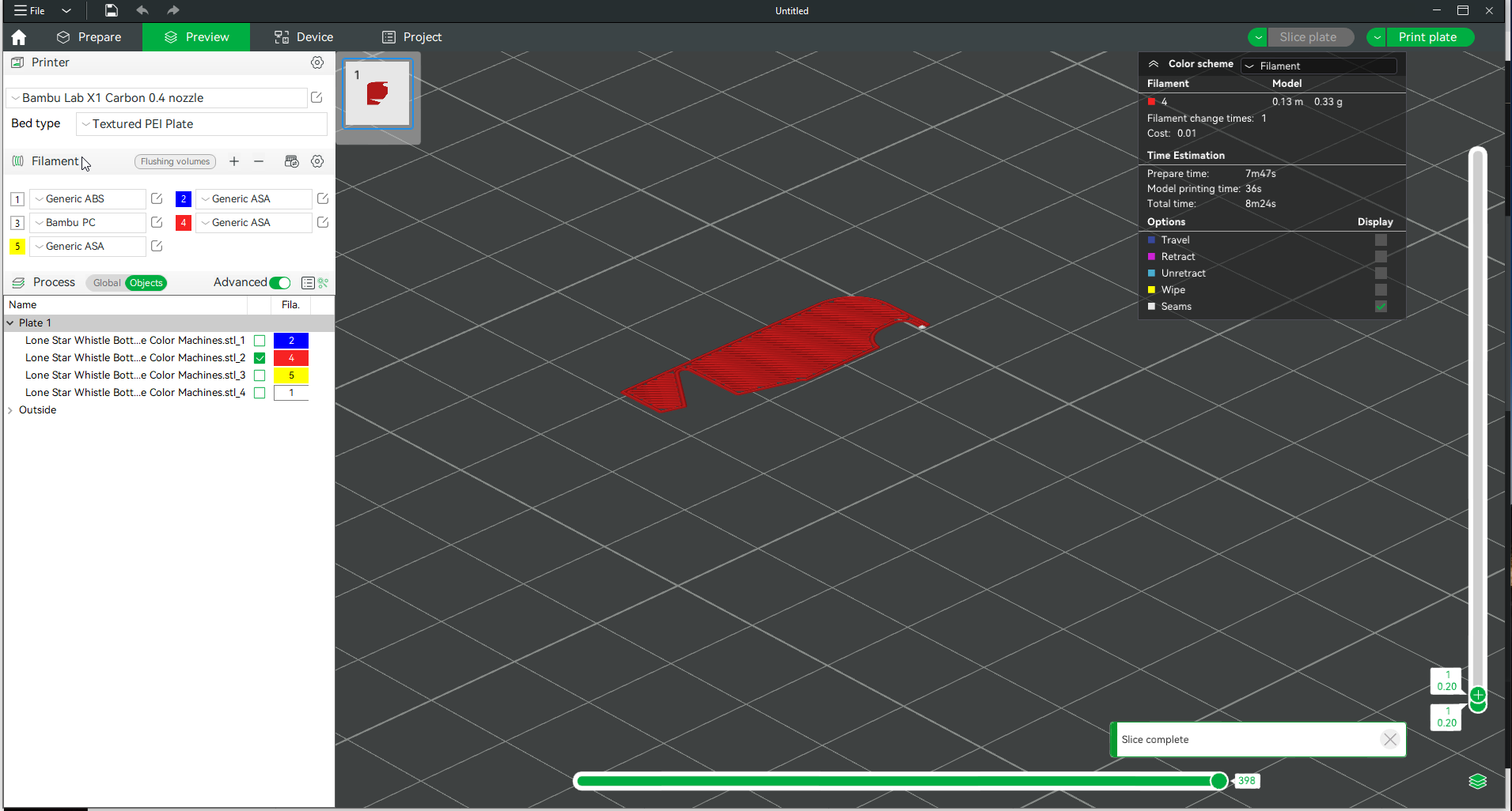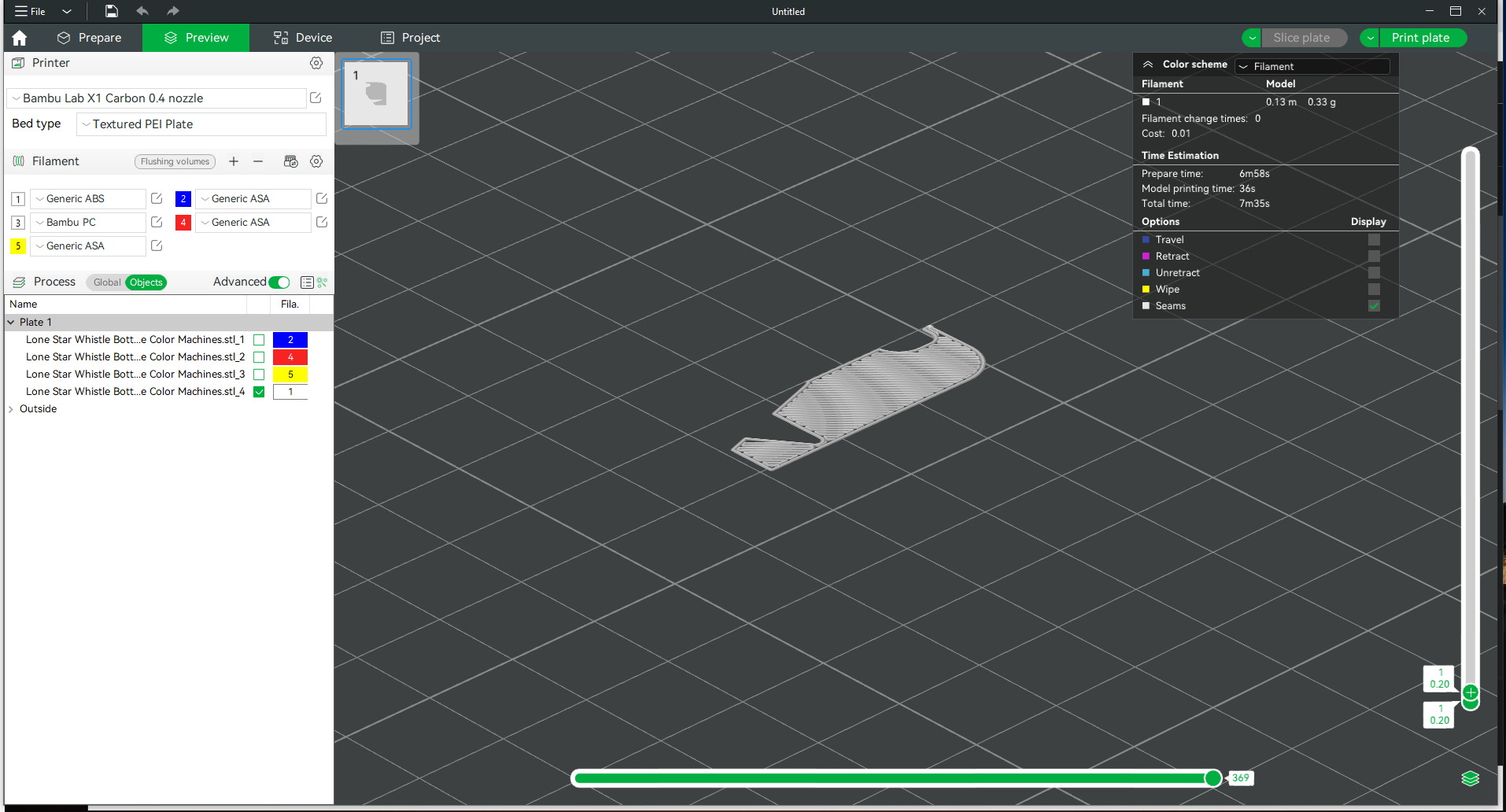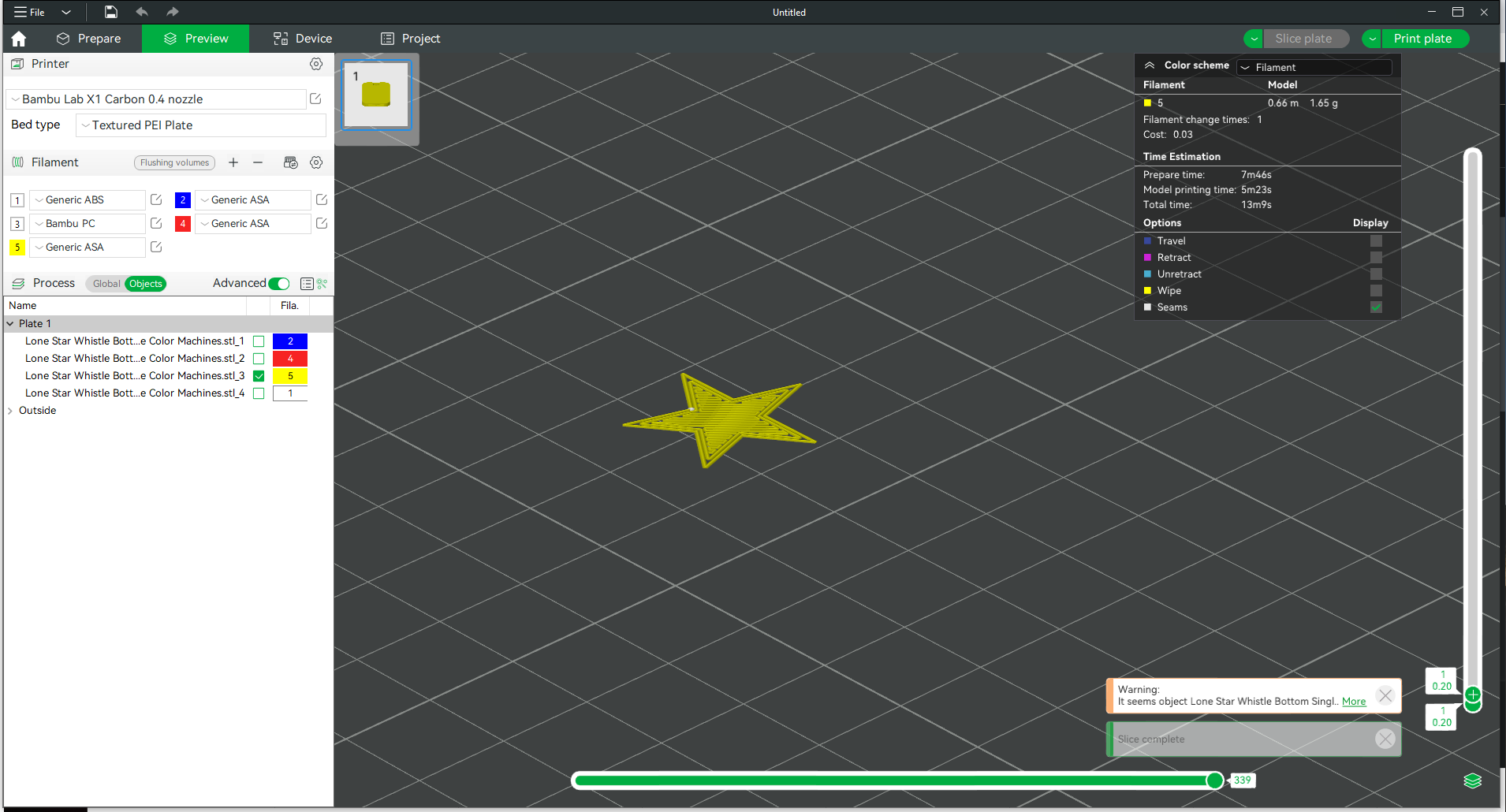 Mấy anh em mới tậu Bambu A1 với A1 Mini mà kiếm cái mẫu in đa sắc đơn giản, vui vui cho cái AMS lite thì đây nè. Đây là bản làm lại từ cái Còi bỏ túi dẹp có hoa văn của anh Jonas Daehnert. Tôi lấy mẫu của ổng rồi thêm vài kiểu hoa văn khác vô cho anh em in đa màu 3D luôn. Mấy cái file STL có sẵn nhiều bộ phận ghép lại trong đó luôn rồi. Anh em cần xài mấy cái slicer như PrusaSlicer, SuperSlicer, BambuStudio, hay OrcaSlicer. Mấy cái slicer này có chức năng cho phép anh em tách cái file STL ra thành từng PHẦN hay OBJECT đó nha. Dày 3mm, dẹp đủ nhét vô bất kỳ cái ví nào. Gắn vô móc khóa, ba lô, túi xách hay làm dây chuyền gì cũng được. Nhỏ vậy mà kêu lắm nha, âm thanh đôi á. Cái tần số âm thanh hơi cao nhưng mà hiệu quả lắm trong việc thu hút sự chú ý của người ta đó. Kích thước: 43 x 22 x 3 mm ##### IN TRÊN MÁY MỘT MÀU In không cần support, xài line width 0.4mm và layer height 0.2mm. Mấy bản mà ghi là bottom only là có thể in trên mấy cái máy một màu như cái ender 3 đó. Cách làm là mở nó ra trong slicer rồi tách cái file STL thành PHẦN. Lúc này anh em có thể tô màu cho mấy bộ phận của cái còi. LƯU Ý: Để cái mẹo này hoạt động được, cái sợi filament dùng để in phần thân chính của cái còi cũng phải được dùng để in ít nhất một mặt tiếp xúc với khay in. Thêm nữa, nếu máy của anh em tự động cân bàn trước mỗi lần in thì phải tắt cái chức năng đó đi hoặc đảm bảo đặt cái vật in trên bàn sao cho nó không ảnh hưởng tới cảm biến cân bàn. Cuối cùng, anh em phải chắc chắn là đặt cái vật in trên bàn ở vị trí mà nó không cản trở việc Z homing. Trường hợp cái còi Lone Star, có bản riêng dành cho người dùng máy một màu luôn nha. Giờ thì tô màu xong hết rồi đó, anh em có thể “Tắt” bớt mấy cái PHẦN. Vì anh em chỉ có máy một màu thôi nên phải in từng màu một. Cái màu dùng để in phần thân chính của cái còi phải in sau cùng. Lấy cái còi Lone Star làm ví dụ, phần thân chính là màu vàng. Nghĩa là tôi muốn bắt đầu quá trình này với mấy màu khác trước, rồi làm màu vàng sau cùng. Tắt bớt PHẦN cho đến khi mấy cái object còn lại đều cùng màu, rồi slice cái bản đó ra và chỉ in một màu đó thôi. Lặp lại quá trình này cho từng màu, nhớ chừa cái màu cho phần thân chính của cái còi lại in sau cùng. Cái màu cuối cùng sẽ in một ít trên khay in rồi sẽ in phần còn lại của cái còi lên trên mấy cái màu kia. Tôi có để hình minh họa quá trình này đó, còn nếu cần thêm trợ giúp cứ hỏi nha. Nếu cần tôi làm video hướng dẫn cũng được. ##### IN TRÊN MÁY ĐA MÀU In không cần support, xài line width 0.4mm và layer height 0.2mm. Nếu anh em in trên mấy cái máy đa màu như Bambu có AMS thì anh em chỉ cần tách file STL ra thành PHẦN, tô màu rồi in thôi. Dễ ẹc!