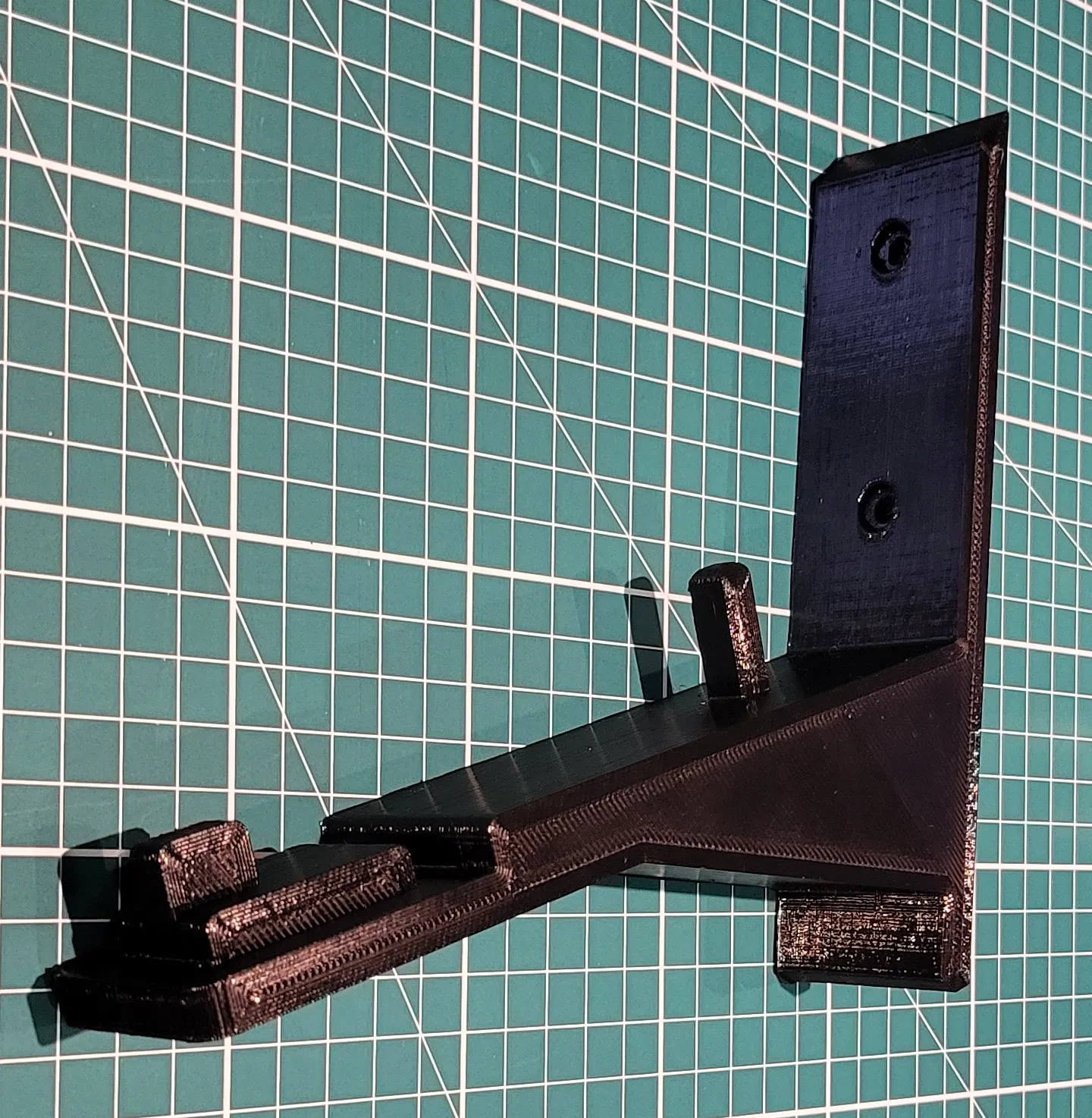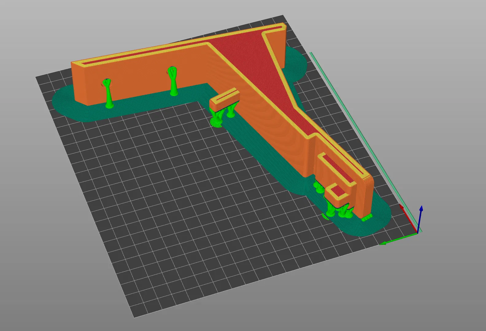 In các bộ phận bằng PETG, các giá treo đặt nằm nghiêng trên bàn in. Chỉ cần hỗ trợ dưới phần Cắt phía trước và các phần nhô ra. Sử dụng vòi phun 0.6mm và chiều cao lớp 0.3mm, 25% mật độ In và 6 lớp xung quanh. Khuyến nghị in với một cái brim nếu bạn gặp sự cố về độ bám dính hoặc cong vênh.