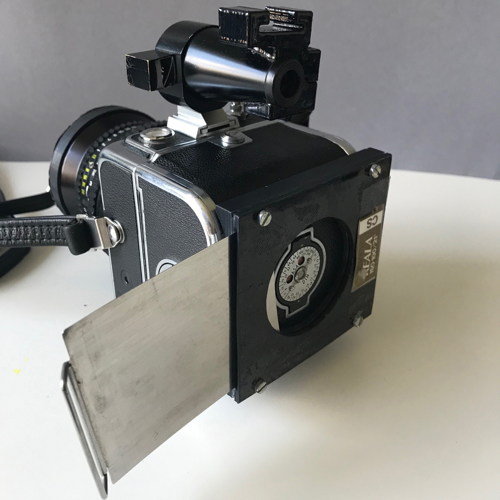 Muốn có cái kẹp giữ dark slide cho ổ A và C của Hasselblad. Đã in thử mấy mẫu có sẵn mà khe cắm khó làm cho vừa ý nên tui tự thiết kế cái này gồm 2 mảnh, dùng ốc M4 và băng keo 3M để lắp.