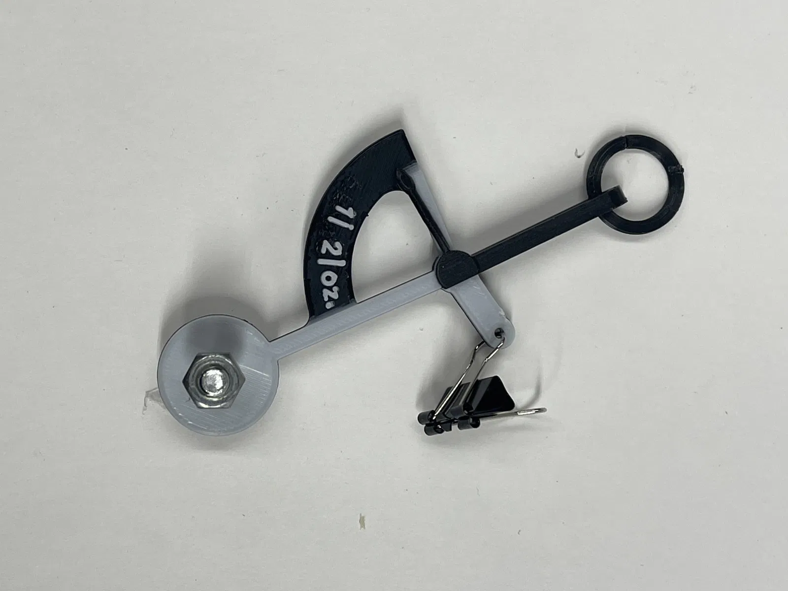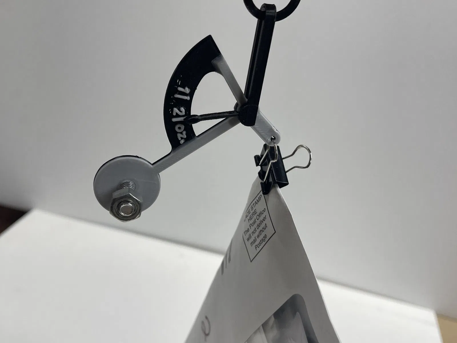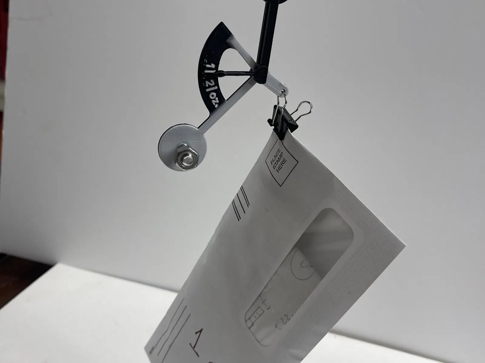 Bạn sẽ cần thêm một cái kẹp vào cân để gắn phong bì và một trọng lượng đối trọng vào lỗ. Tôi đã sử dụng một cái bu lông ¼” x 1” và đai ốc.