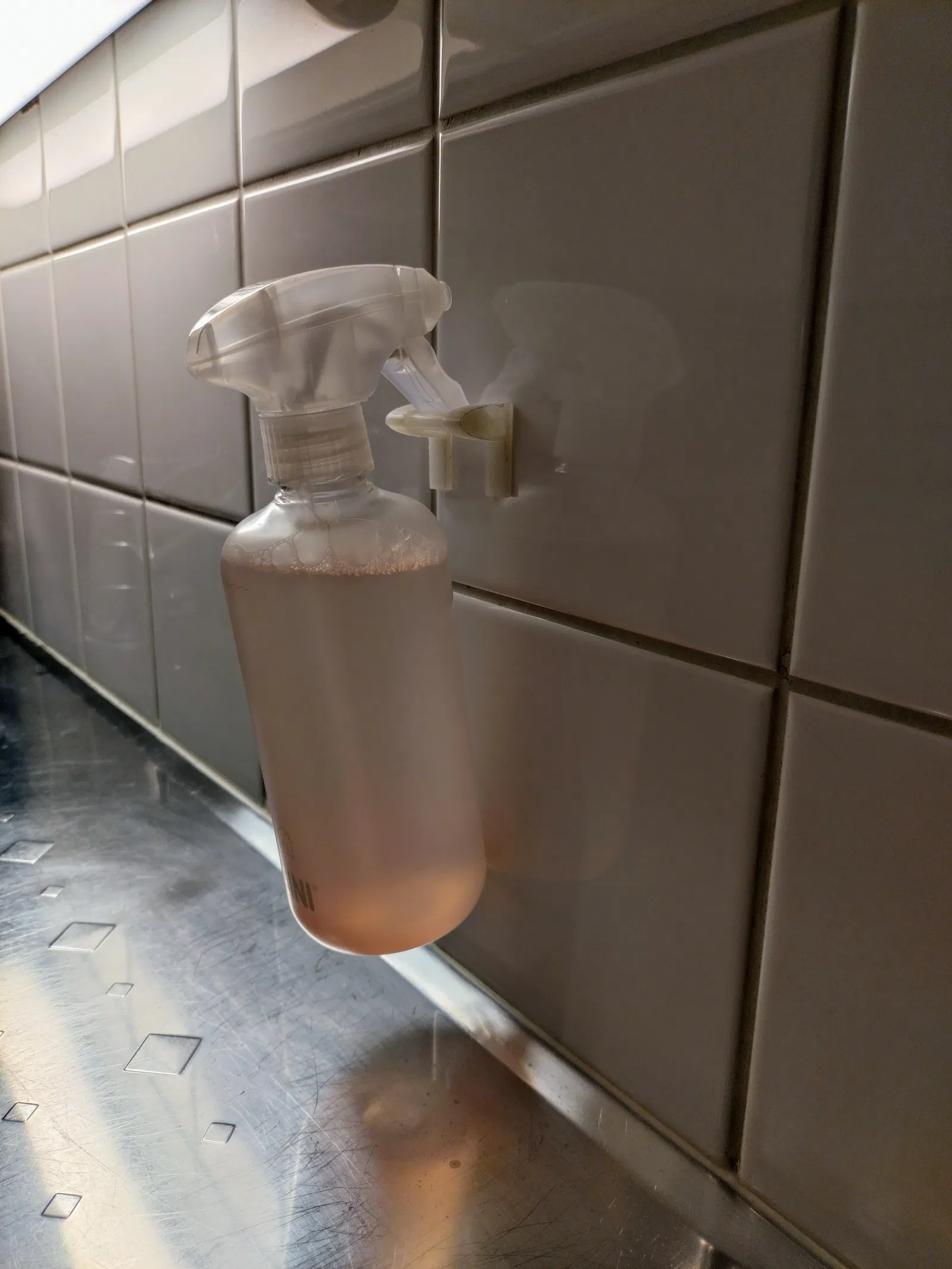 Kệ đựng chai xịt tùy chỉnh hoặc các sản phẩm treo khác. Thanh đỡ dày 6mm có thể thay thế bằng thanh dài hơn để đựng nhiều chai hơn. Gắn lên tường bằng băng keo hai mặt.