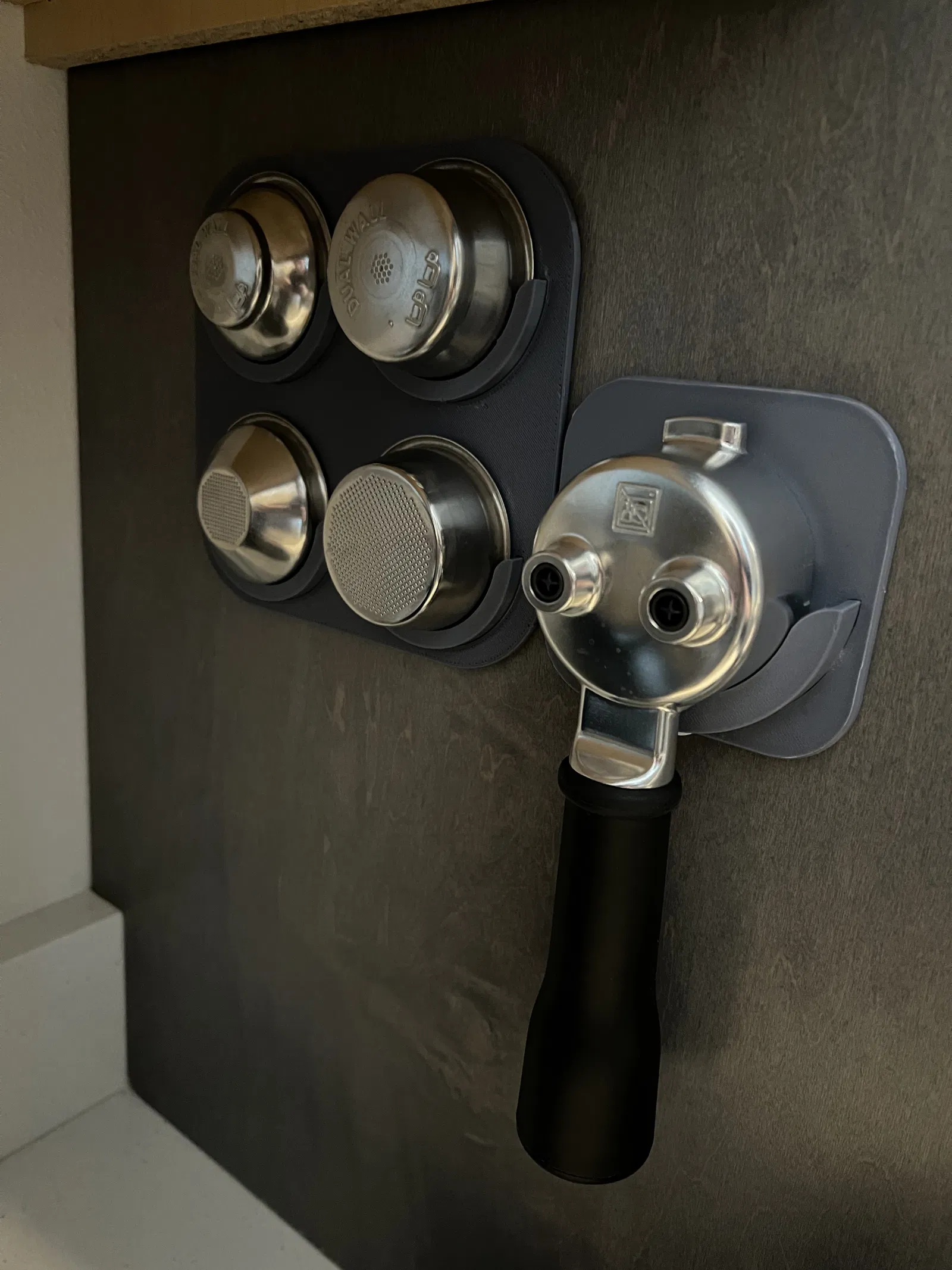 Tao muốn có cái chỗ để sắp xếp với cất mấy cái rổ lọc với tay pha cà phê cho cái máy pha cà phê Breville Bambino của nhà mình. Cái này làm nhanh gọn để cất mấy cái rổ lọc, dán lên tường bằng keo 3M cho nó chắc ăn.