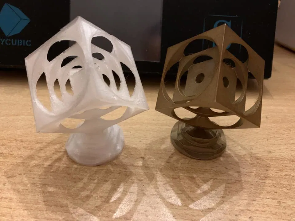 Vì tôi vẫn còn bản vẽ nên tôi đã vẽ lại nó bằng Fusion và cũng in nó ra. Phần đế ban đầu là sản phẩm phụ phát sinh khi tiện, nhưng ở đây nó được tận dụng rất tốt. Cả hai bộ phận có thể được kết nối bằng một con vít M3 hoặc M4 nhỏ. Khối lập phương này cũng có thể đứng được mà không cần đế (nếu bạn không thích nó).