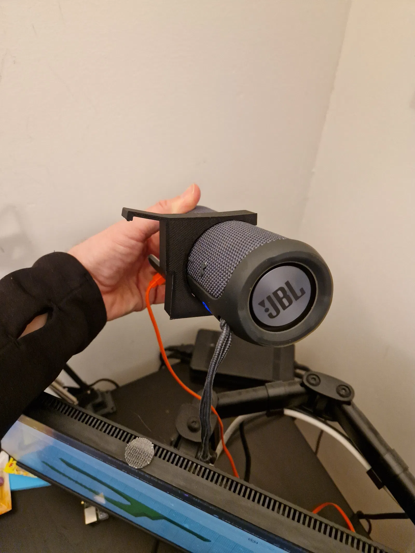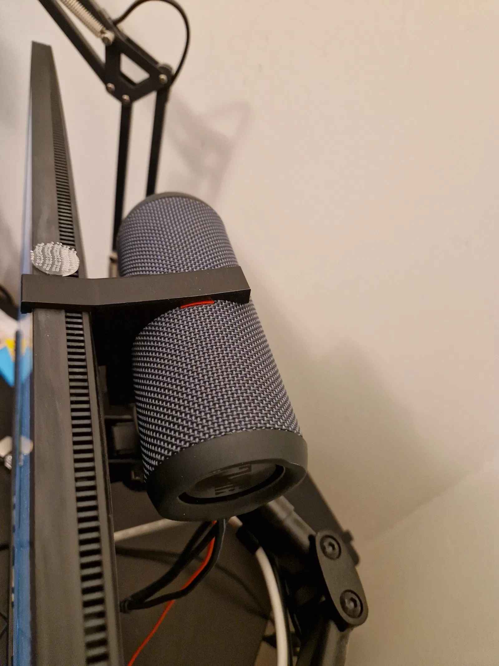 Một cái đế/giá đỡ rất đơn giản cho loa bluetooth JBL Flip Essentials. Nó giữ loa, và cái móc ở mặt trước của màn hình. Mình đang xài màn hình DELL 24