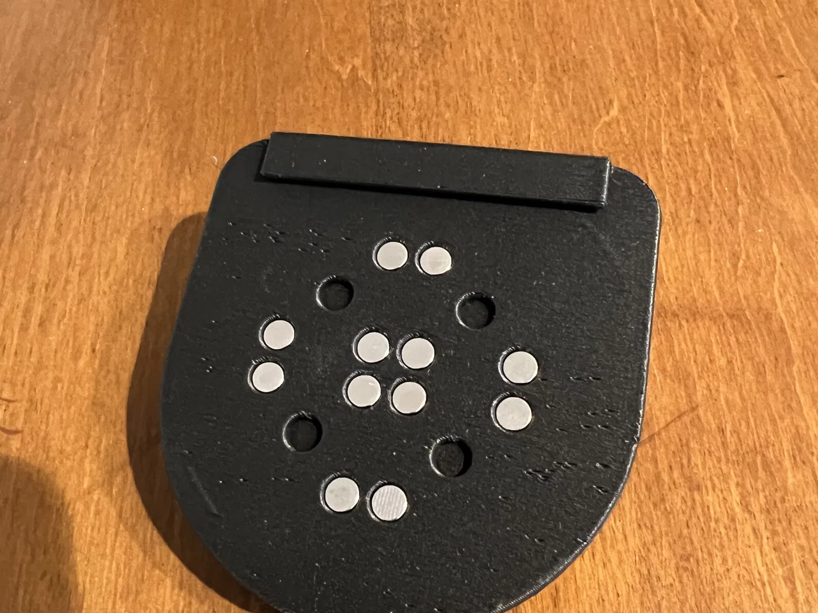 Thiết kế ban đầu đã được thay đổi để ổn định hơn, và bao gồm một clip trên rộng hơn và một loạt các rãnh để giữ 6x2mm nam châm. Thêm nhiều nam châm tùy ý, và tùy thuộc vào độ chính xác của máy in, có thể cần keo siêu dính để giữ nam châm.