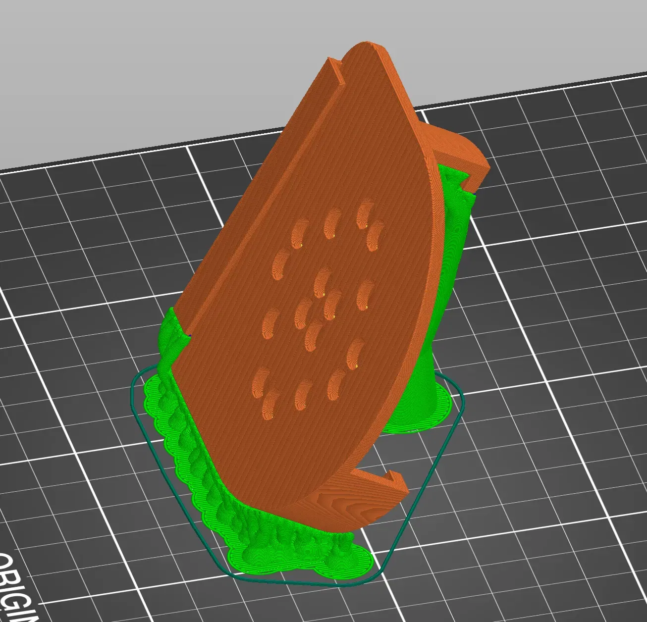 Tốt nhất là in ở tư thế nằm nghiêng khoảng 30 độ, sử dụng hỗ trợ cây, và với clip trên được xoay 90 độ so với cách sử dụng dự định, sao cho các đường lớp cuối cùng sẽ thẳng đứng khi lắp đặt.