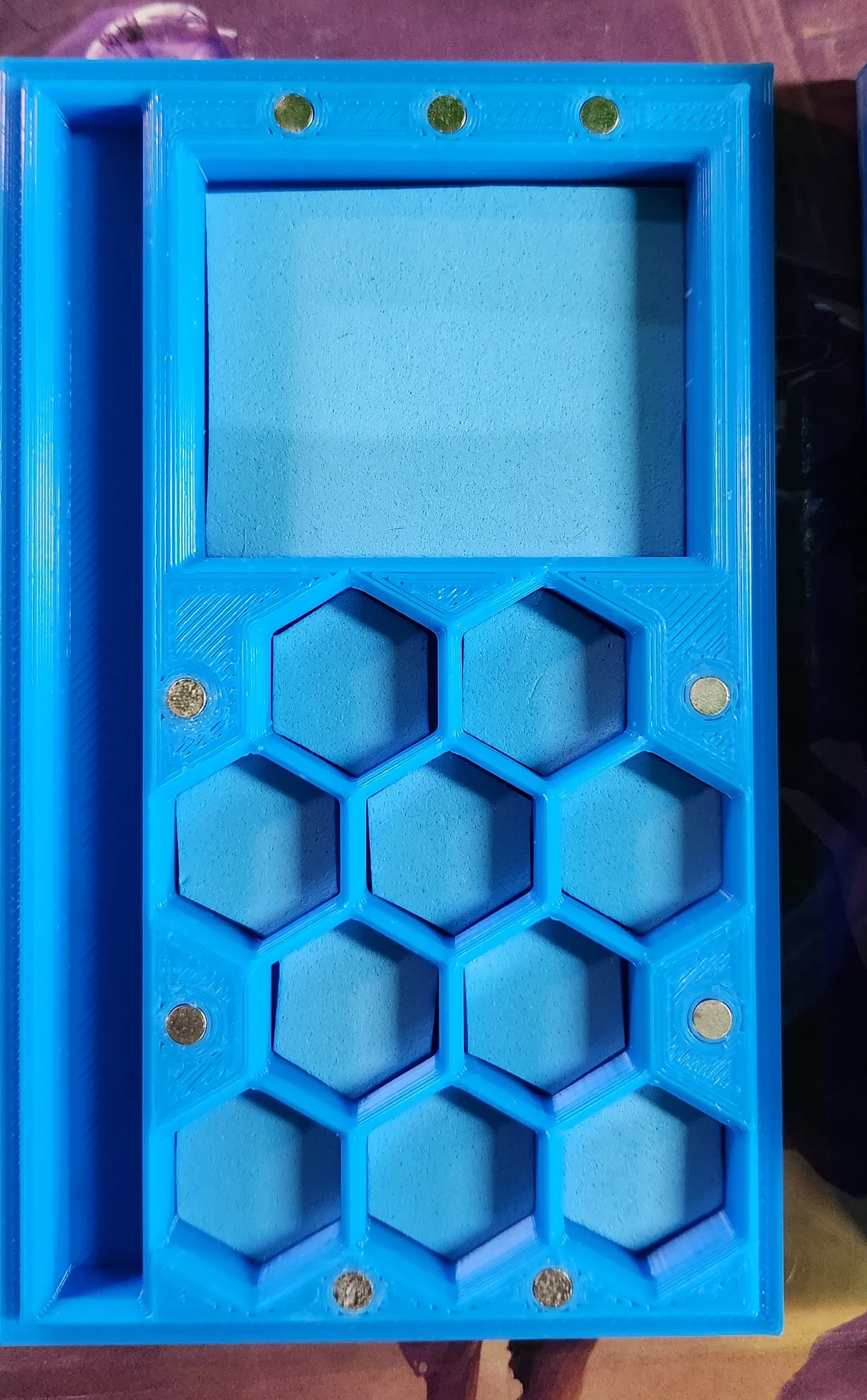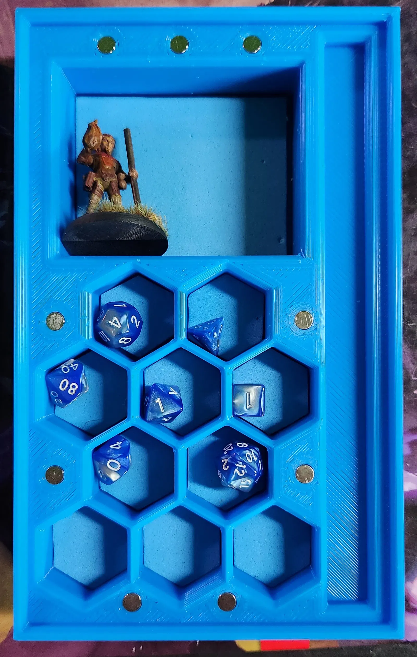 Bản remix hộp đựng xúc xắc, đế mini và chỗ cắm bút. Phiên bản này có hộp mini sâu hơn để vừa đế 30mm với 4mm cho đệm EVA foam.