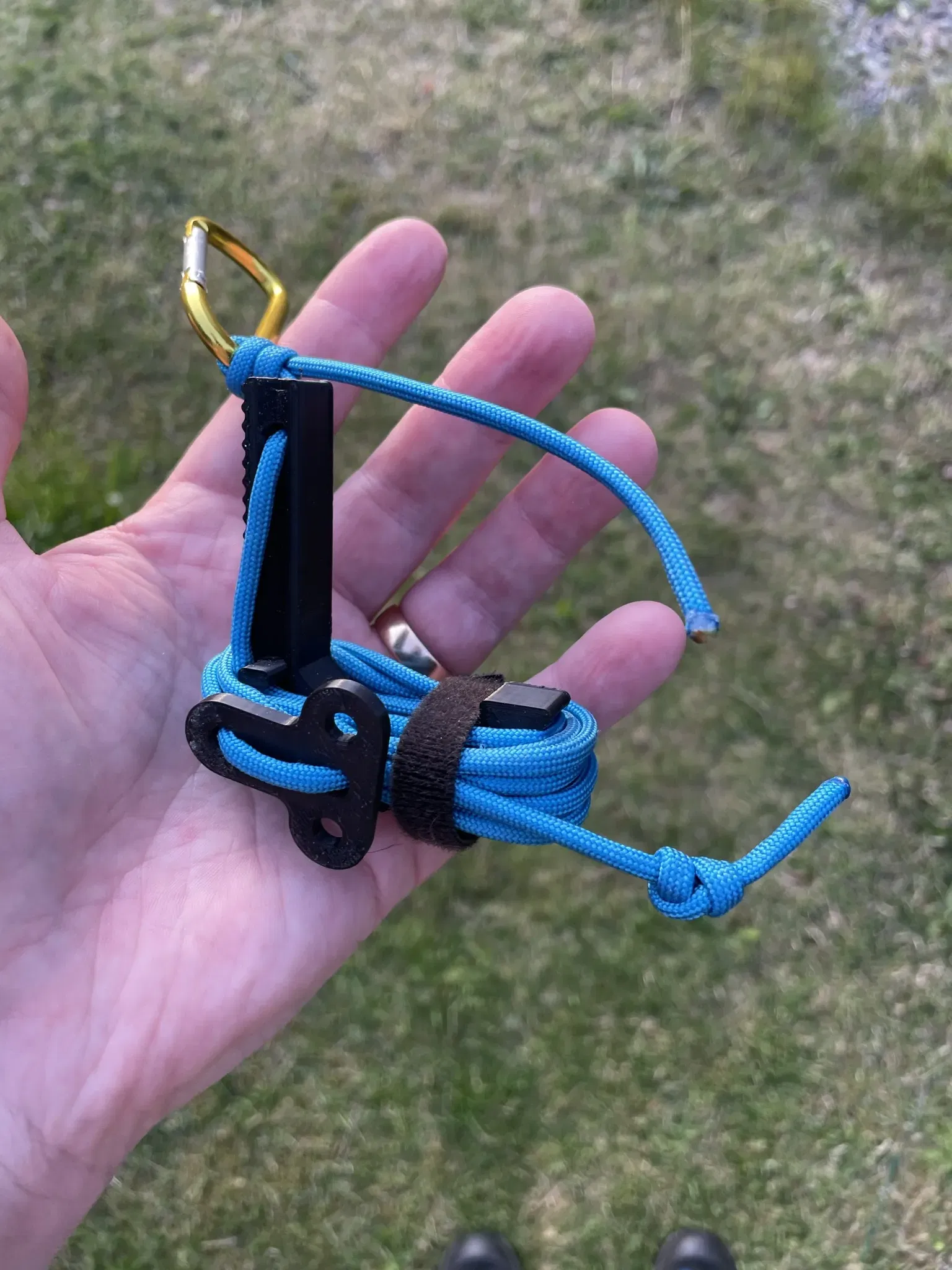 Tôi đã sử dụng dây paracord 7 sợi, cái này thừa sức nhưng đó là những gì tôi có ở nhà. Tôi có khoảng 1.5m paracord, nhưng với một dây mỏng hơn bạn sẽ có thể chứa nhiều hơn. Còn về khóa carabiner, bạn có thể sử dụng cái rẻ nhất bạn tìm thấy hoặc cái có thể chịu tải nặng hơn, vì vậy nó là một món đồ đa năng.