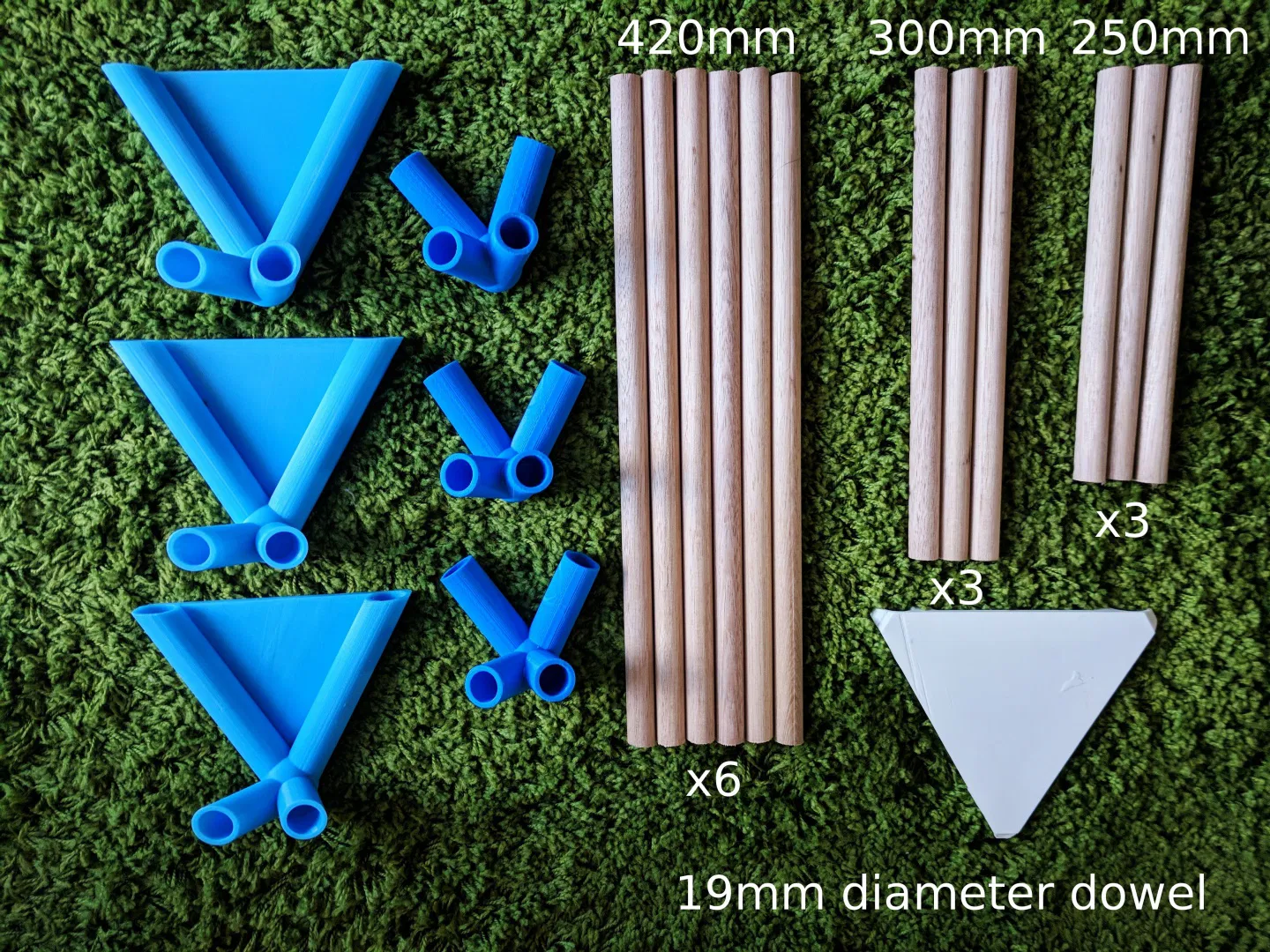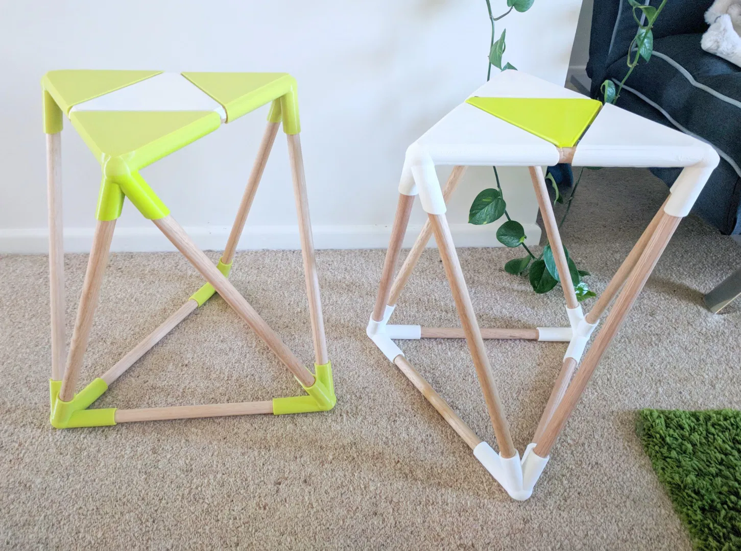 Ghế đẩu in 3D này có thể lắp ráp bằng thanh gỗ tròn 19mm tiêu chuẩn. Thiết kế chắc chắn, dễ dàng tháo lắp, chỉ cần in các chi tiết góc và tam giác, sau đó cắt thanh gỗ theo kích thước và lắp ráp lại.