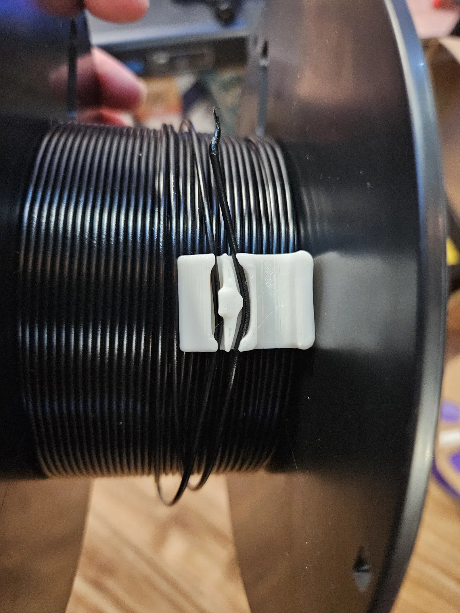 Tui có một cái kệ ngang để cất dây tóc 3D và mấy cuộn dây được để sát nhau. Sau khi xem qua mấy cái kẹp khác, tui quyết định làm cái này. Nó sẽ kẹp dây tóc lại với nhau bên trong cuộn để có thể xếp chồng lên nhau, hoặc để sát bên cạnh.